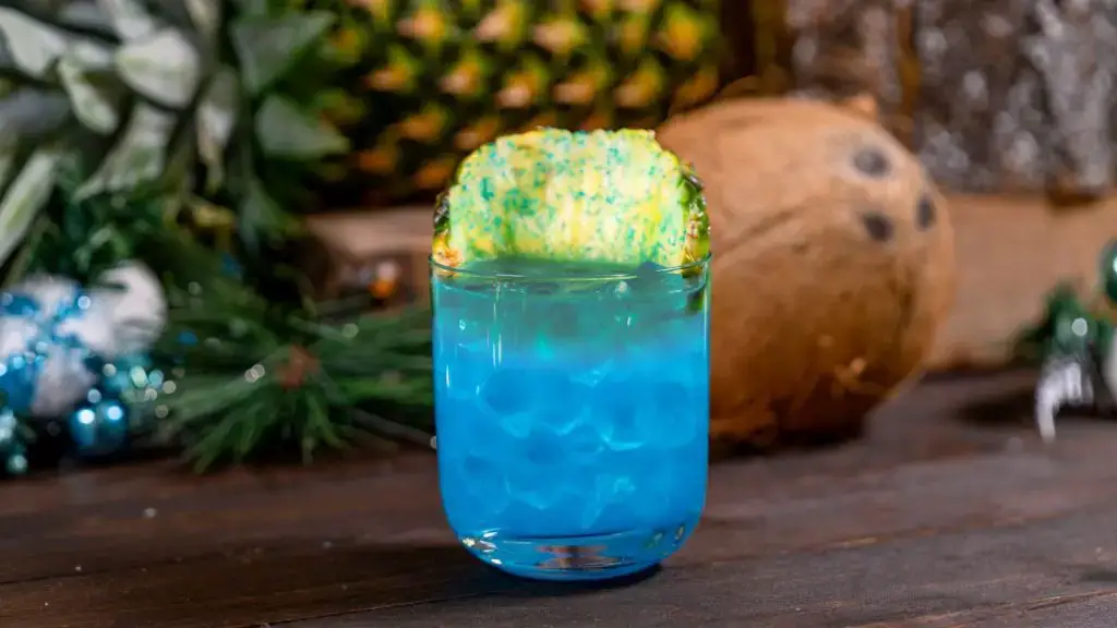 - Blue Tropical Cocktail: Rum, pineapple, orange and lemon juices, blue raspberry syrup, and coconut purée garnished with a blue sugar-coated pineapple wheel and a dark rum float (New)