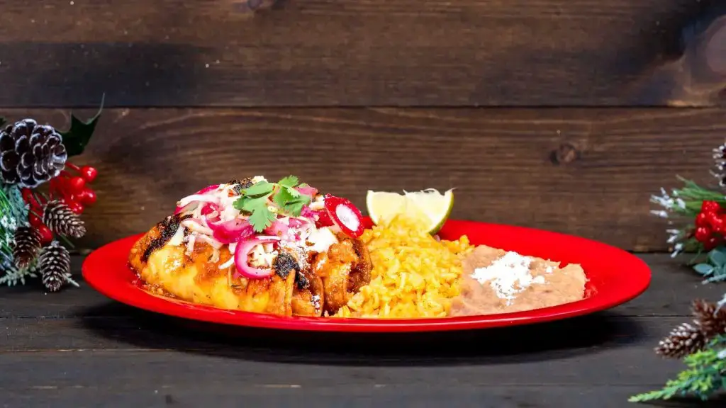 - Tacos Dorados de Camarón: Two shrimp tacos fried to a golden brown topped with zesty slaw, salsa roja, salsa macha, and crema served with Spanish rice and refried beans (New)