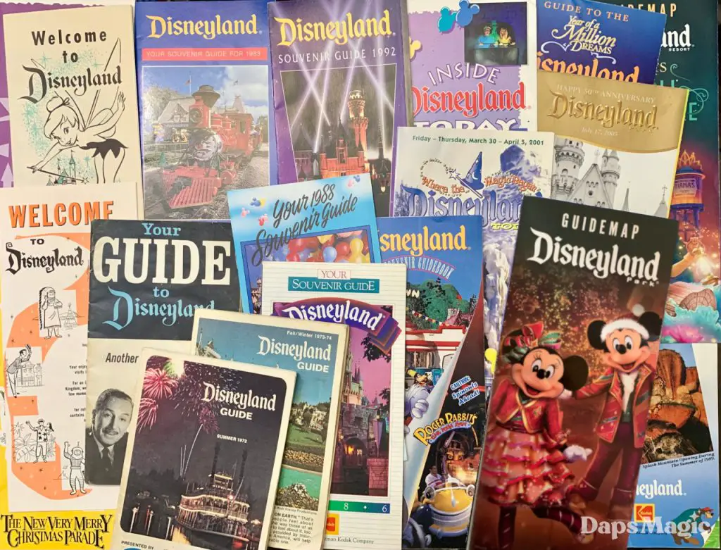 Among the things to which I cannot say “No” are Disneyland guide maps. These free printed brochures have been available since the opening year of the Happiest Place on Earth, 1955. They have gone by a variety of names and have had varying degrees of information inside. The earliest guides were simple tri-folds. By the mid-1990s, they were virtual booklets, weighing in at as many as 24 pages.
