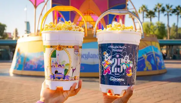 The Disneyland Resort has announced that 2 new Magic Key-exclusive popcorn buckets will be available in 2026. One of these buckets has a design that continues the Disneyland Resort 70th Celebration. The other celebrates the 25th anniversary of Disney California Adventure. Each bucket will be available starting on January 13, 2026. Between January 13 and February 24, 2026, they will be refillable for $2.25. Here are the official details about these Magic Key popcorn buckets: