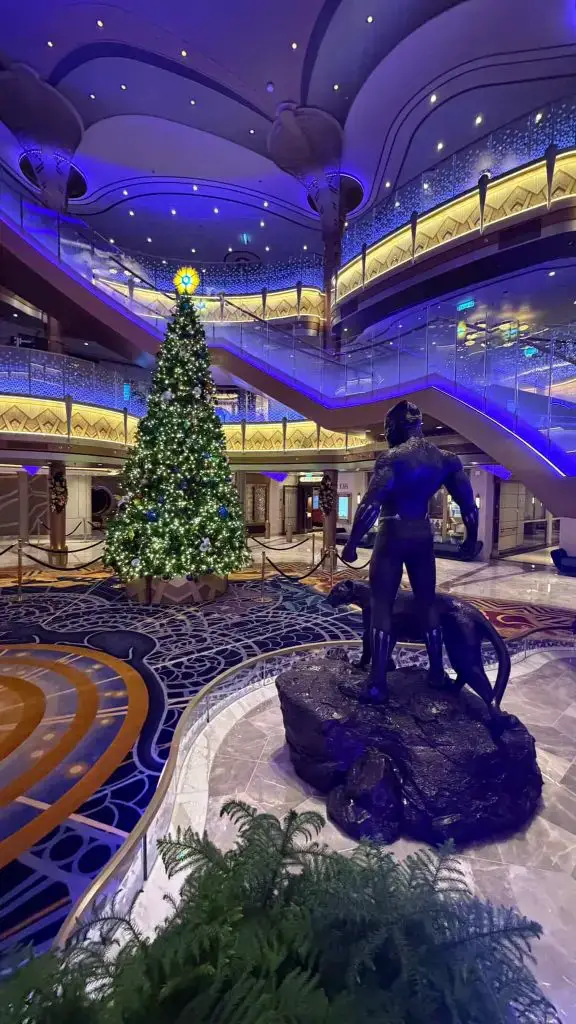 The tree can be found in the Grand Hall and fits the theme of this space. Across the room, the statue of the Black Panther appears to be looking at it. The tree is a beautiful holiday addition to this brand-new ship in the Disney Cruise Line fleet. Take a look at the photos of the tree aboard the Disney Destiny here:
