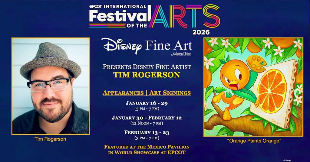 Orange you glad it’s Festival season at EPCOT? If you love a little classic Walt Disney World nostalgia, you won’t want to miss this! We’re thrilled to welcome Disney Fine Artist Tim Rogerson to the EPCOT International Festival of the Arts 2026—and he’s bringing a brand-new piece that’s pure sunshine: “Orange Paints Orange,” featuring the one and only Orange Bird.