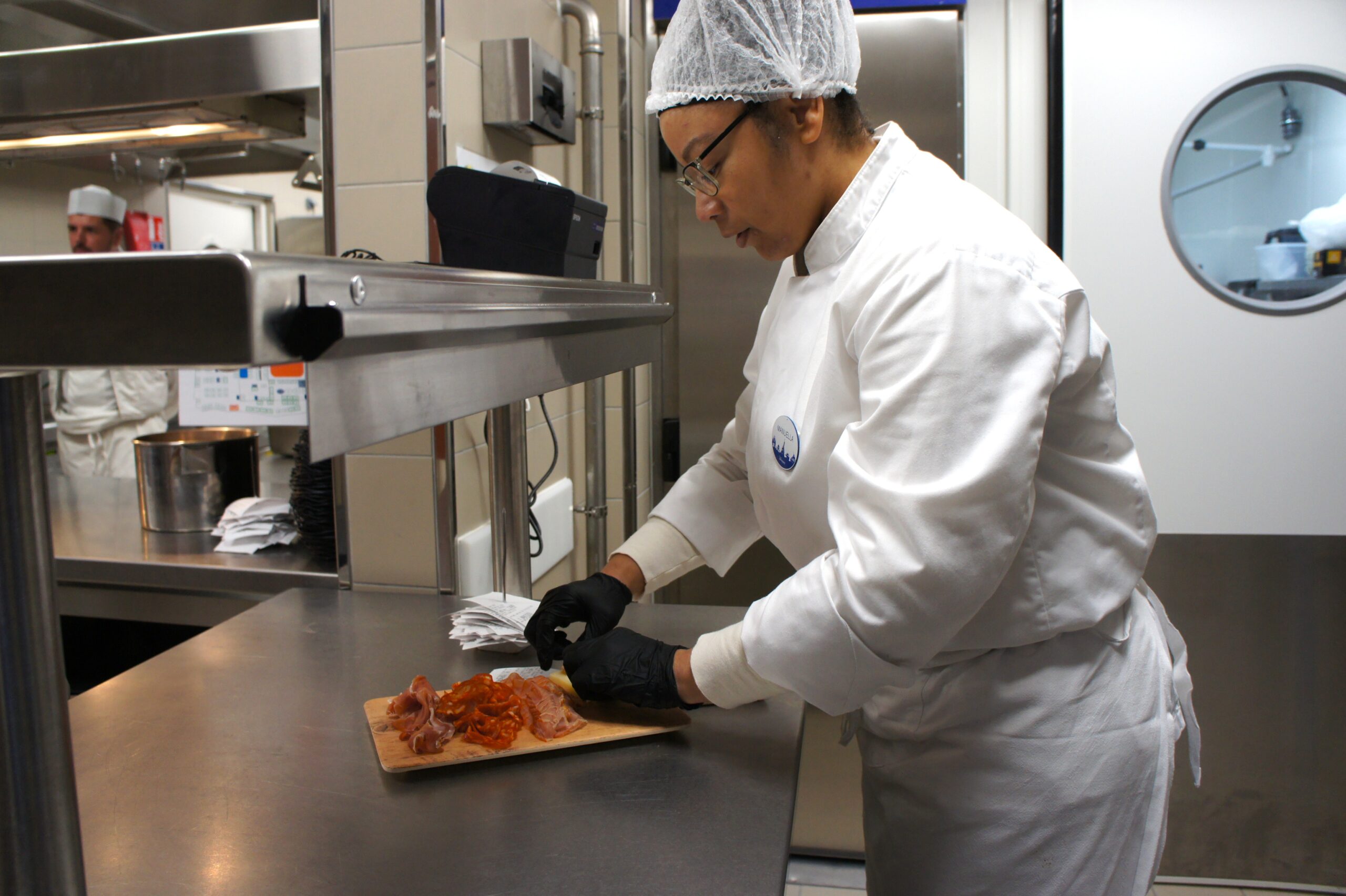 In the cold dishes section, Manuella, demi-chef de partie, draws on her 13 years at Disneyland Paris to prepare platters of cold meats, salads, and sandwiches. Like the bar, everything here is made on-site.