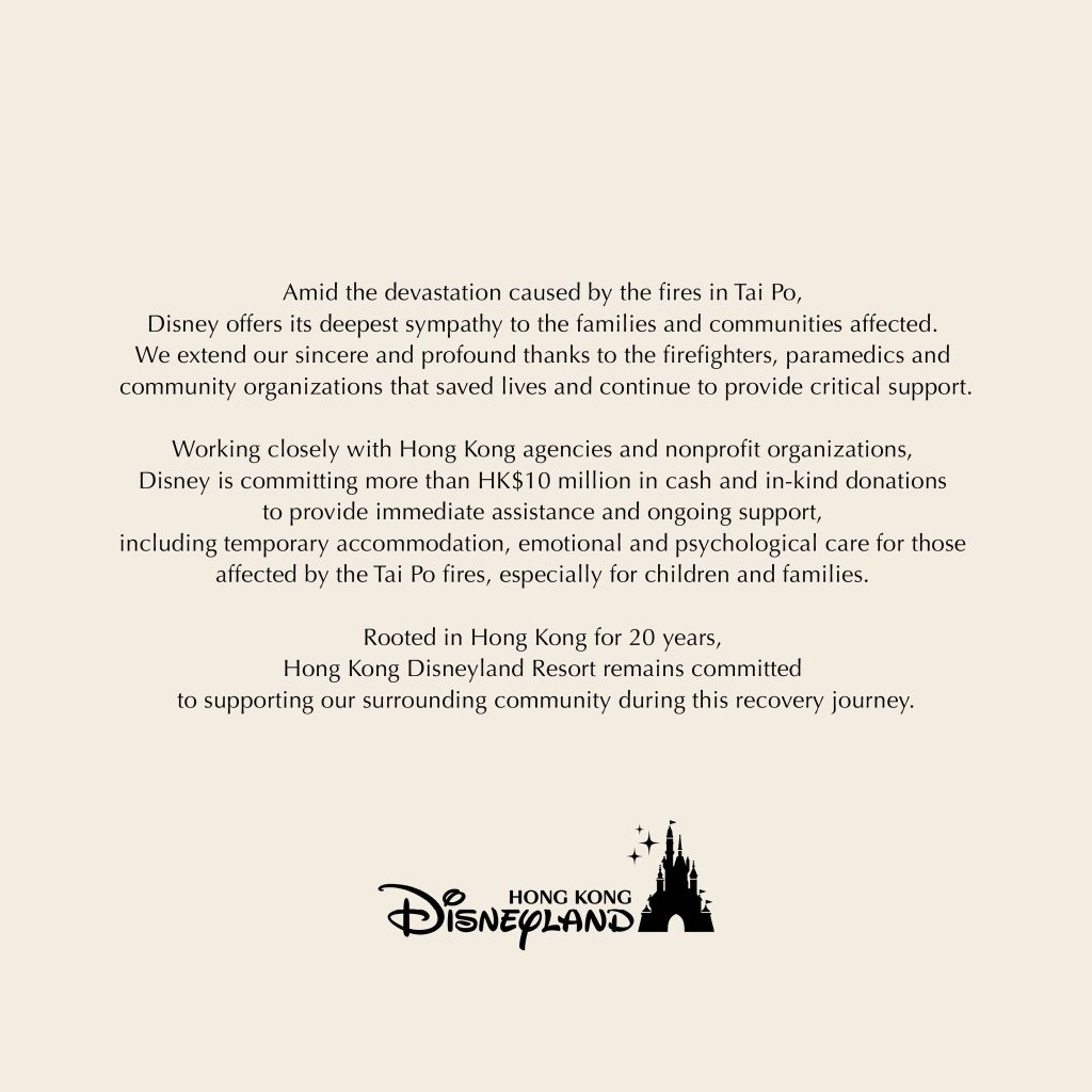Amid the devastation caused by the fires in Tai Po, Disney offers its deepest sympathy to the families and communities affected. We extend our sincere and profound thanks to the firefighters, paramedics and community organizations that saved lives and continue to provide critical support.