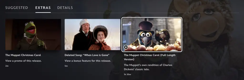 - In Extras, click on “The Muppet Christmas Carol (Full Length Version)“