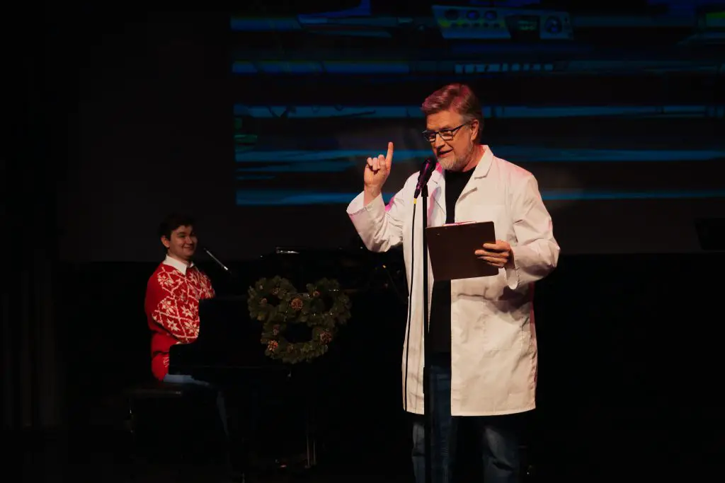 One would think that all of Noah’s friends who contributed to this show would have been referenced already. However, there are more! There was an opening poem that had the artwork of Peterson Muldoon. Each piece of art was beautiful and worth being framed and hung somewhere. Taryn Wyss brought incredible sewing talents to the show and created a beautiful suit for Santa Claus, who made a fantastic appearance at the end of the show (and also seemed similarly jolly to Brock Powell). Joe Hagen took care of sound, Hayden Evans donated art, Rose Rosolino ran the projection screen, and many others helped as well!