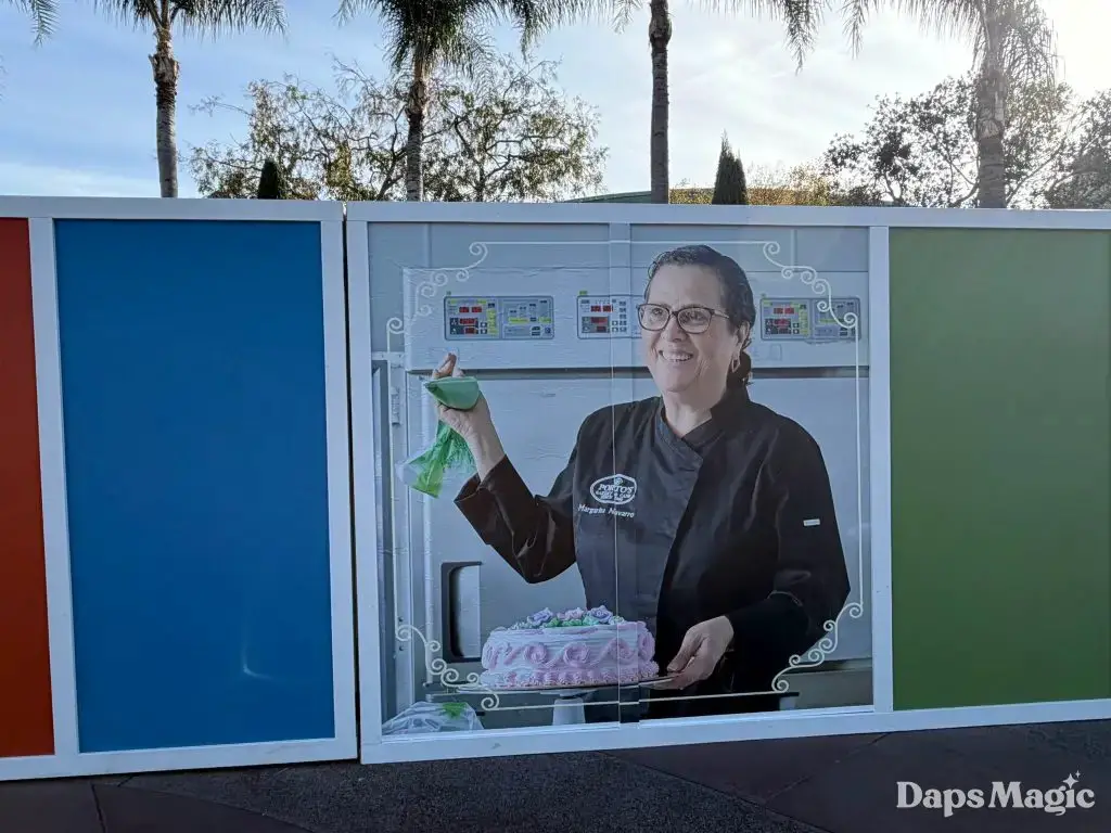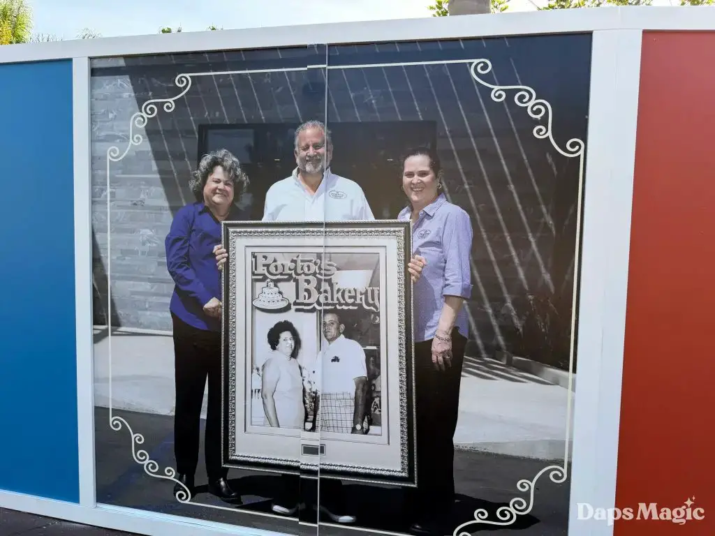 More new walls have appeared in the future home of Porto’s Bakery and Cafe in the Downtown Disney District at the Disneyland Resort. These new walls showcase the history of Porto’s and act as an introduction to the future restaurant for Disney fans. Along with showcasing the history and legacy of Porto’s, there is also a photo of presumably the current family with a photo of the founders, food, and more!