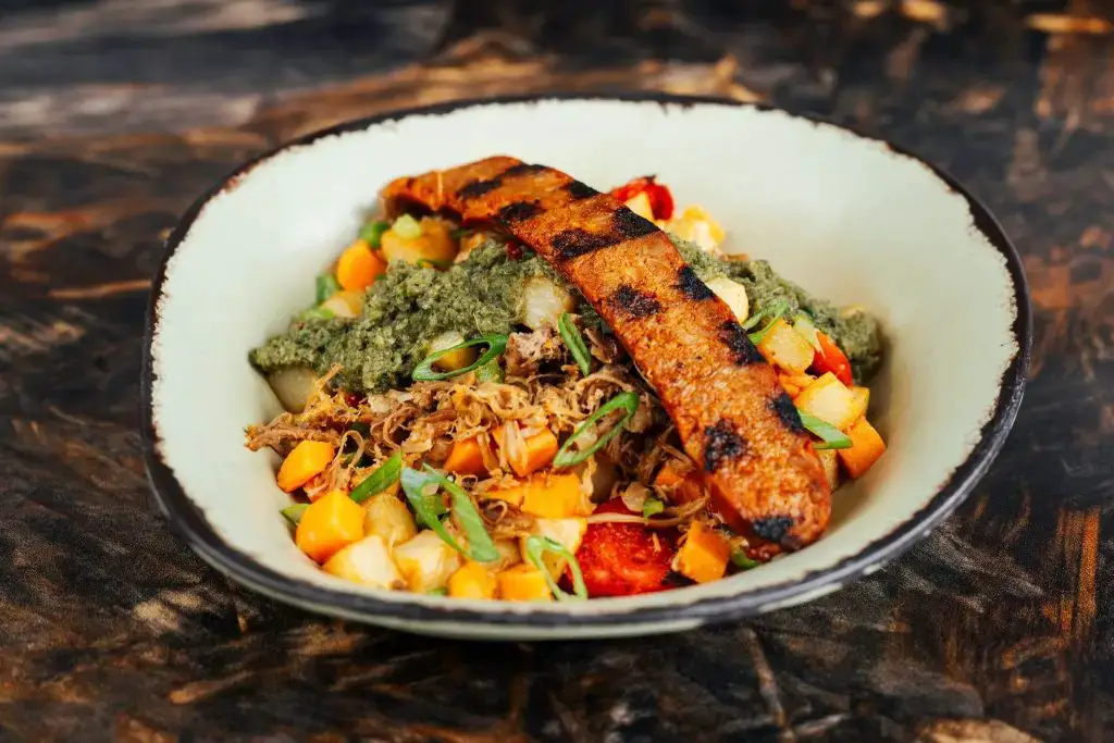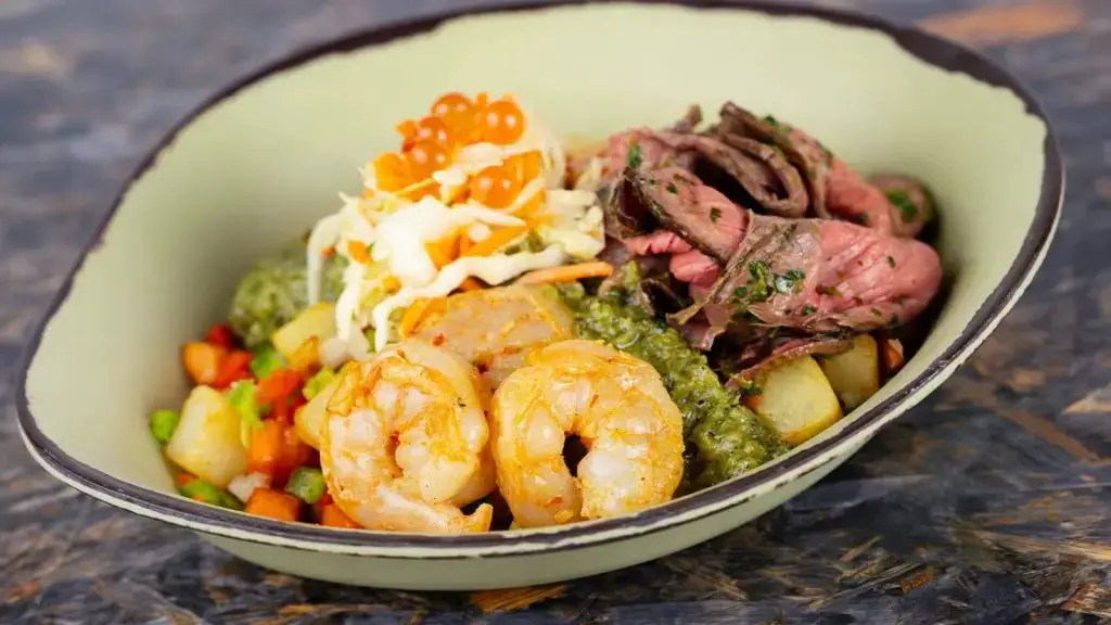 While at Satu’li Canteen, you can also enjoy Chimichurri Beef and Chili-Garlic Shrimp. This is chimichurri beef paired with shrimp tossed in a chili-garlic sauce, topped with crunchy vegetable slaw and boba balls, and served with your choice of base. Base options include red and sweet potato hash, noodles, rice and beans, and a hearty salad. You can also choose not to have a base for your meal.