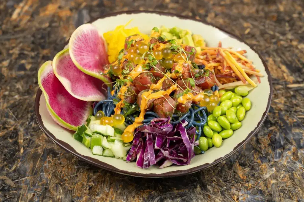 Another item to enjoy at Satu’li Canteen is the Ocean Moon Bowl. This dish is served with blue noodles, tuna, watermelon radish, pickled daikon, rainbow carrots, avocado, cucumbers, and red cabbage with miso and sweet soy drizzle topped with micro cilantro.