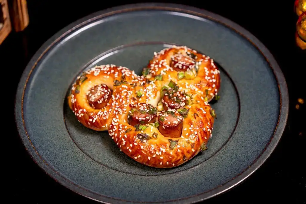 - *Mickey-Shaped Hot Dog Bun: Classic milk bread with hot dogs, hoisin glaze, parmesan, green onion, and sesame seeds