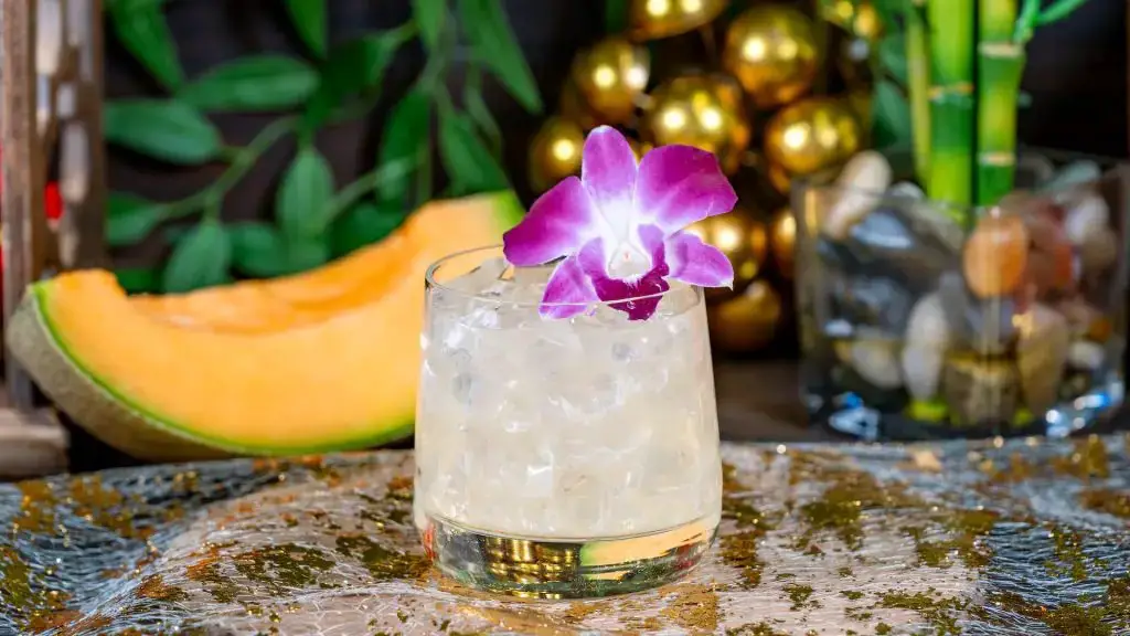 - Yuja-Melon Cocktail: Gin, Lillet Blanc, yuja purée, and rock melon syrup garnished with a purple orchid (New)