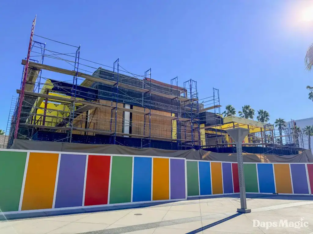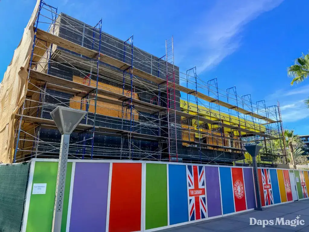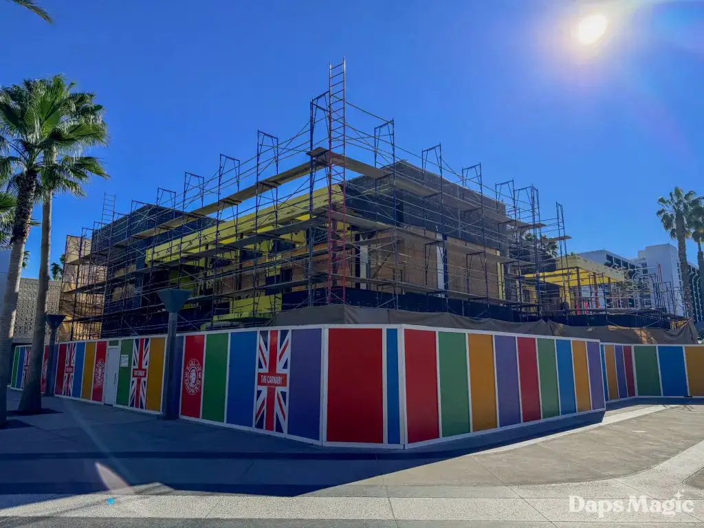 The scrims around the new home of the Earl of Sandwich in the Downtown Disney District were down this weekend. This came as Santa Ana wins buffeted the Disneyland Resort. With the scrims down, guests at the Disneyland Resort could see the progress that is being made on the location. This comes ahead of its opening sometime this year.