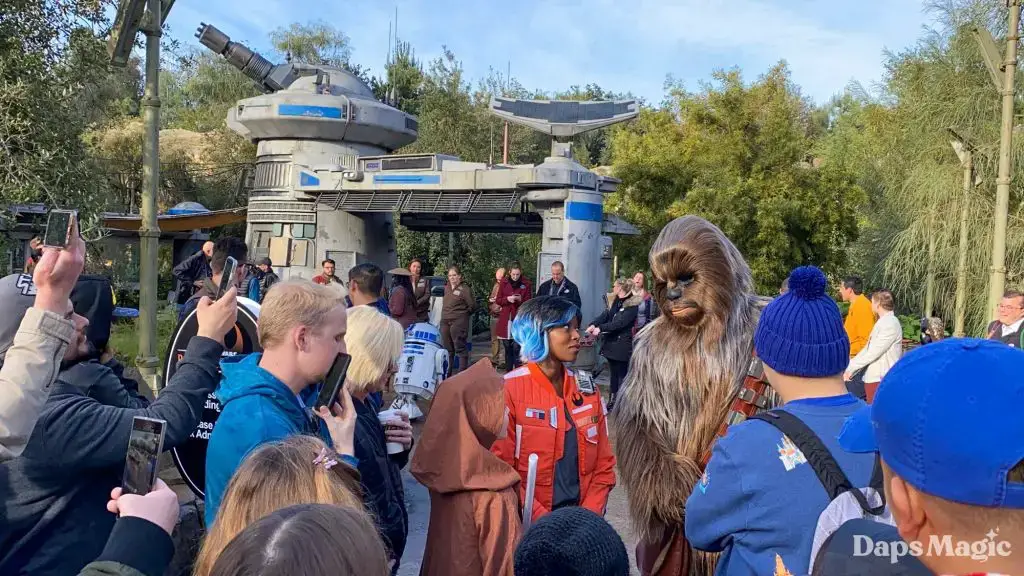 Within minutes, guests had dispersed from Main Street. Many made their way to Star Wars: Galaxy’s Edge, including the Daps Magic team. Unsurprisingly, it was fairly busy. Ronto Roasters was particularly packed as Star Wars fans sought out a Star Wars breakfast (one I still enjoy today!). Over at Star Wars: Rise of the Resistance, various characters could be seen near the entrance. When the Daps Magic team passed by, R2-D2 was right near the entrance of the attraction, and Vi Moradi could be found with Chewbacca chatting with guests about their mission.