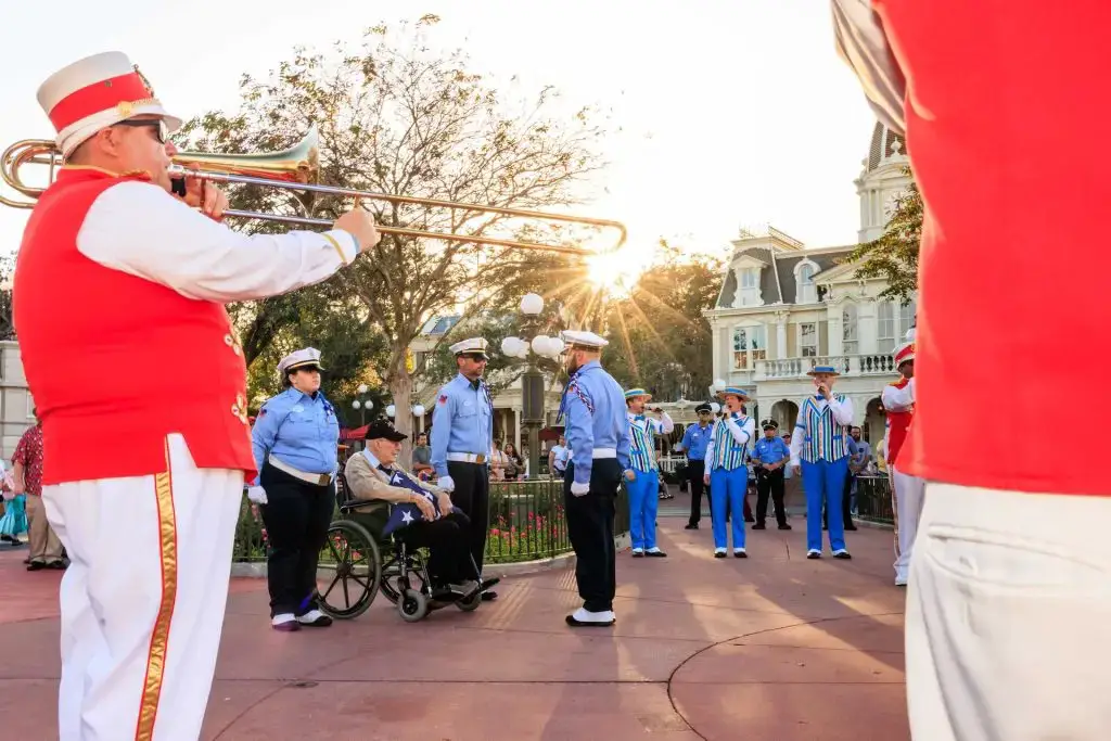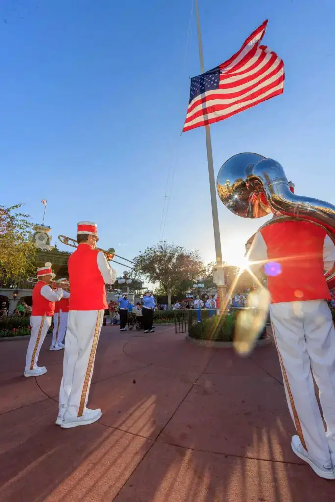 The daily flag ceremonies date back to the openings of Disneyland in 1955 and Magic Kingdom in 1971. Each day, these ceremonies honor U.S. veterans and service members. At Magic Kingdom, a guest is chosen from the park’s daily visitors to serve as the “U.S. Armed Forces Representative of the Day” for the ceremony.