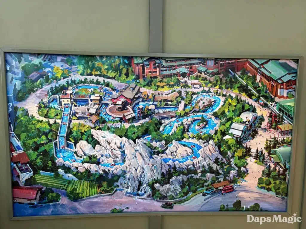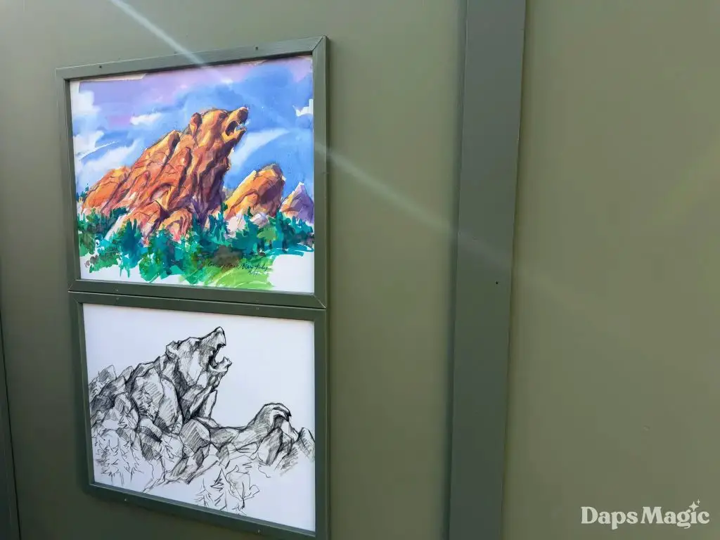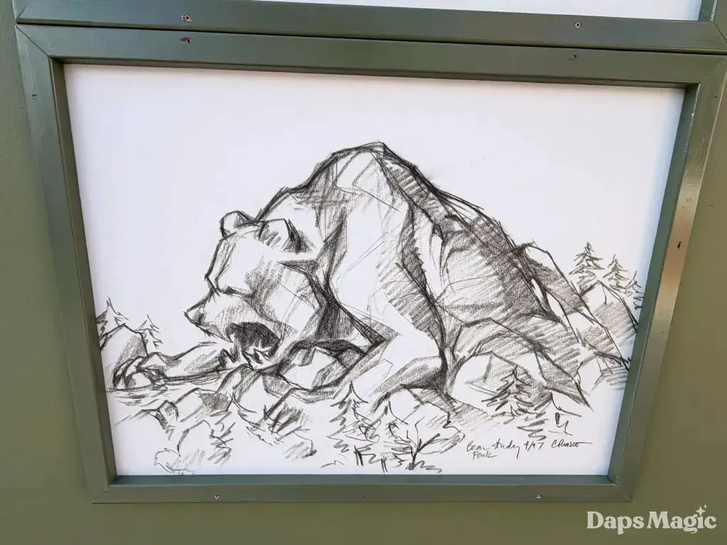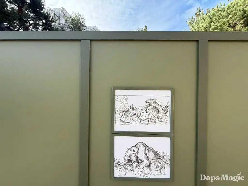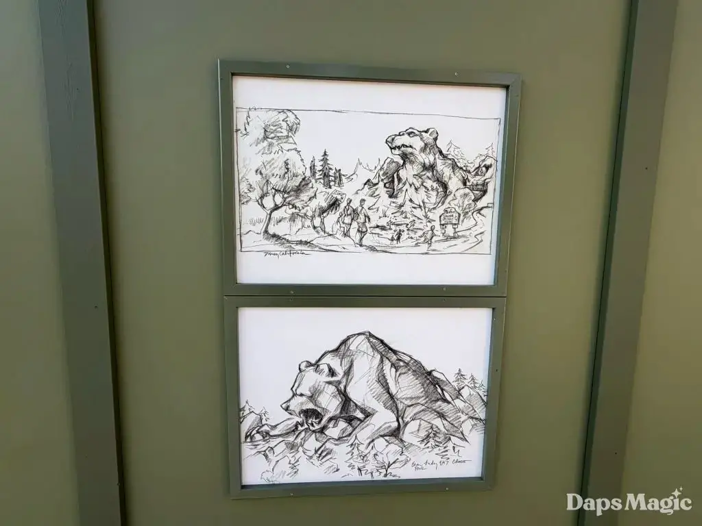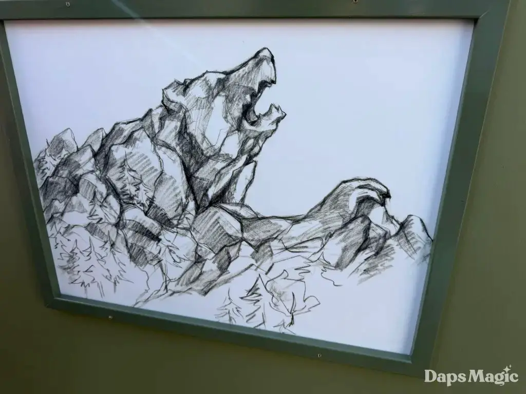 Grizzly River Run is currently undergoing an extended refurbishment that began after the holidays. As the refurbishment continues, some new concept art has been added to the walls that surround the attraction and the mountain. The artwork represents different parts of the concept art process. It also shows some different ideas for how the area could have turned out. Beyond that, some fun details can be found in the artwork if one looks closely.