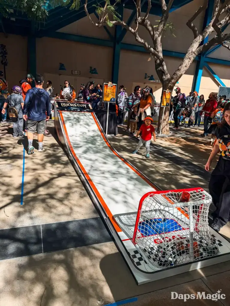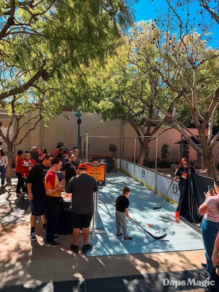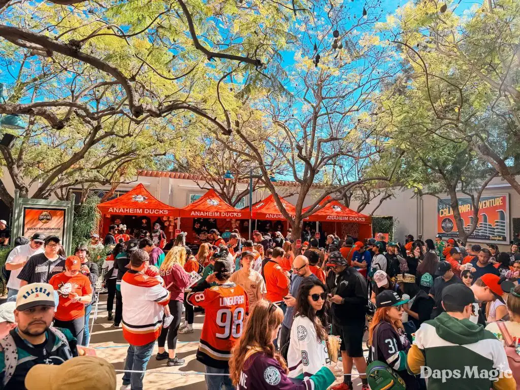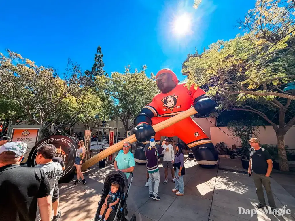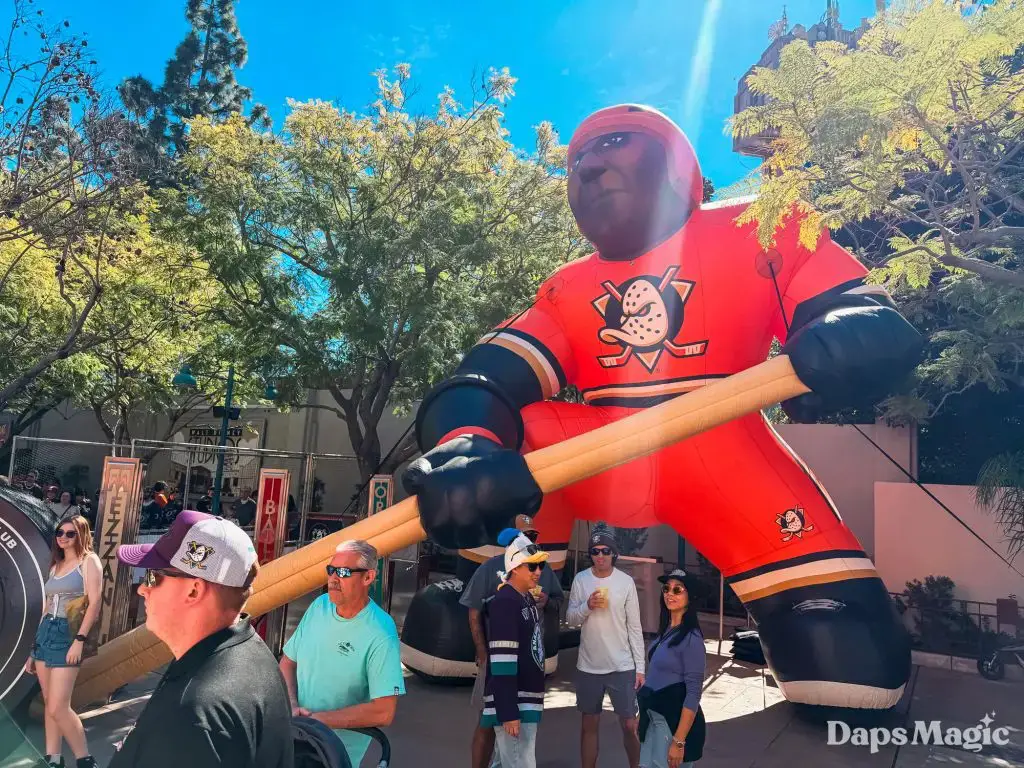 Before the park opened, hundreds of guests had already lined up in hopes of getting a coveted wristband that would allow them to get a photo with the Anaheim Ducks players. The wristbands disappeared very quickly once distribution began. Then the focus point became merchandise. The area in the queue of the Hyperion Theater became the “Locker Room” with games and activities, the merchandise, photo opportunities, and no shortage of energy. Throughout the day, the Ducks Power Players also made appearances. There was also an incredibly long line for the event merchandise, which progressively sold out throughout the day.