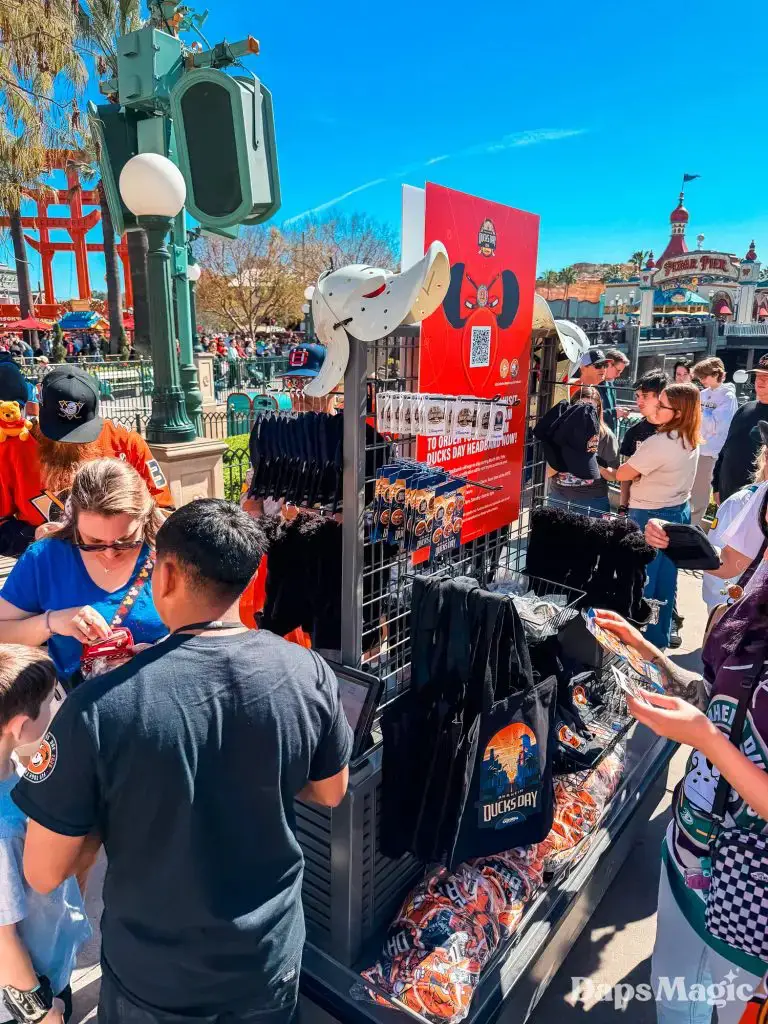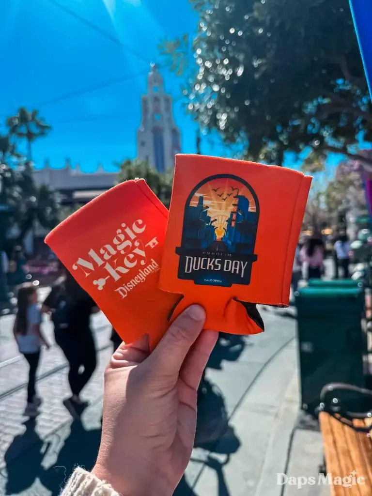 For Magic Key holders, a giveaway was held at the Kingswell Shop on Buena Vista Street. The line for the special Anaheim Ducks Day beverage holder swelled throughout the morning before ultimately running out.