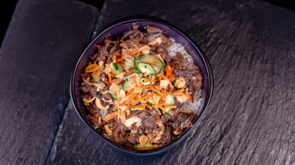 - *Bulgogi Bowl: Bulgogi beef and gochugaru-marinated cucumbers over rice garnished with spicy mayo, crispy shallots, and sesame seeds (New)