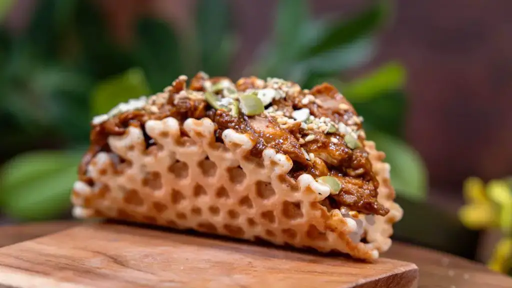 - *Chicken and Waffle Mole Taco: Waffle taco shell filled with chicken in spicy mole sauce, white rice, pepitas, and sesame seeds (New)