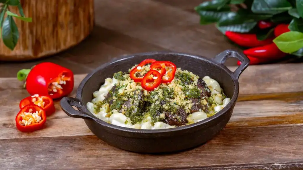 - *Sirloin Gruyère Mac & Cheese with black garlic chimichurri, garlic butter crunch, and Fresno chile slices