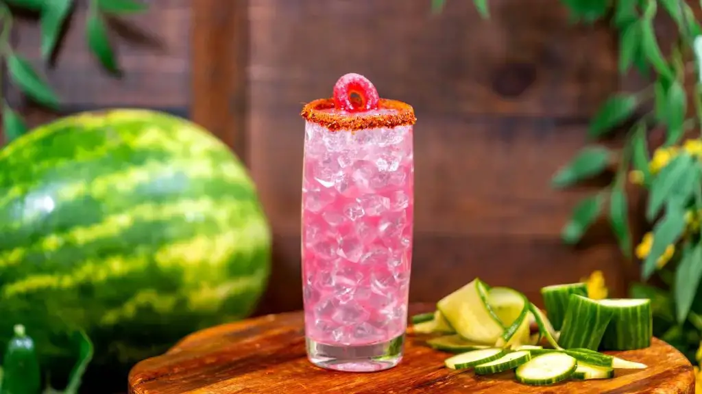 - Watermelon Cucumber Mojito: White rum, watermelon liqueur, mojito and cucumber syrups, watermelon purée, and lime juice topped with Topo Chico and garnished with a watermelon gummy wedge and Tajín twist