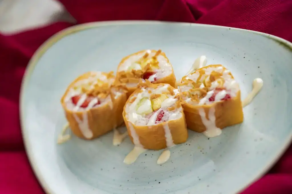- Frushi: Strawberry, pineapple, and honeydew wrapped in coconut rice and soy wrap paper served with coconut cream sauce and toasted coconut
