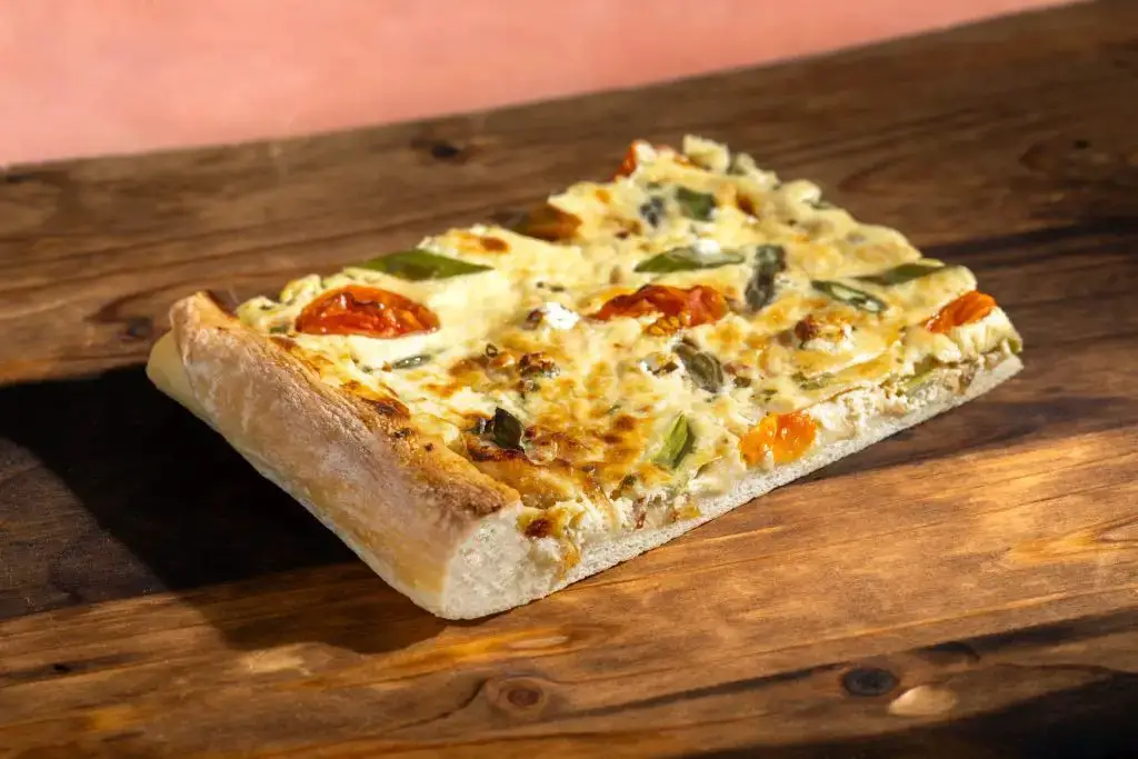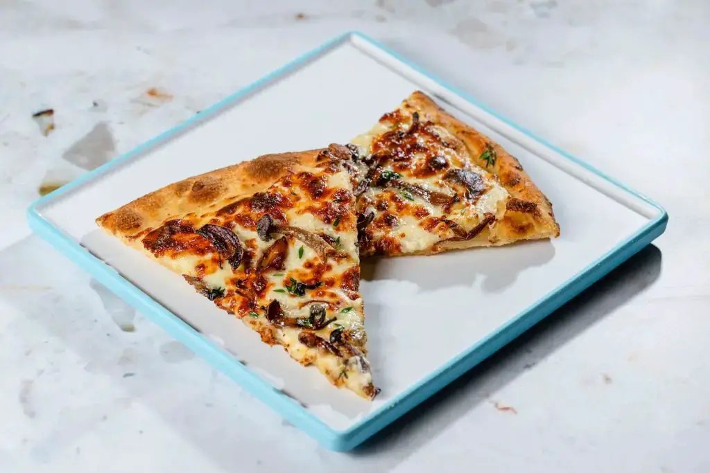 - Pizza Bianca: Two slices of freshly baked pizza topped with roasted wild mushrooms, garlic cream, mozzarella, cheese blend, truffle oil, and thyme (New)