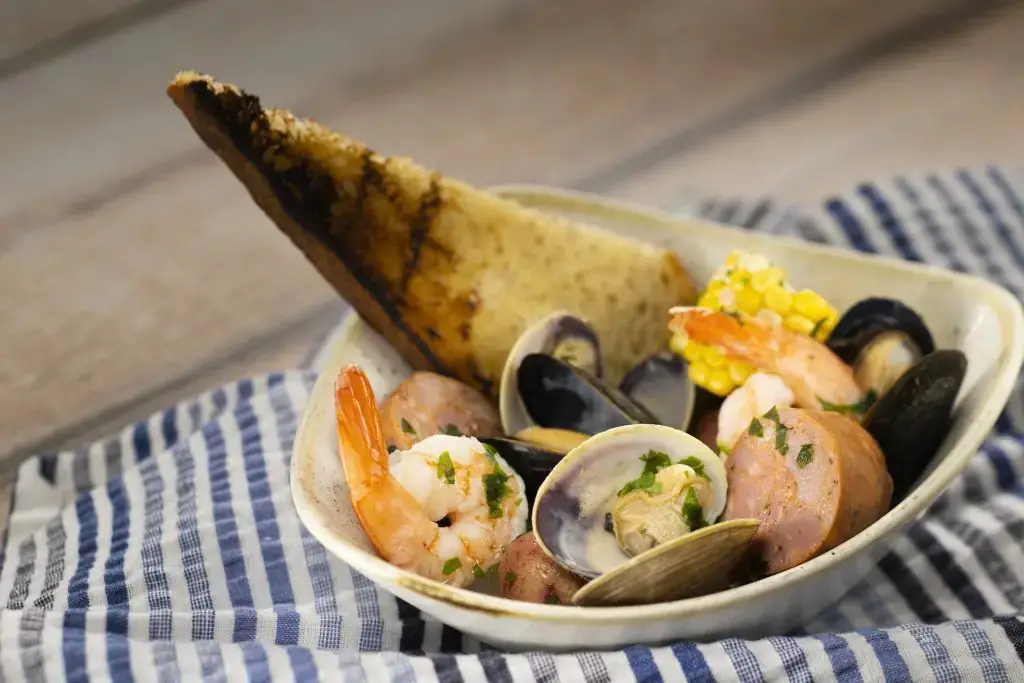- Seafood Bake with shrimp, mussels, clams, andouille sausage, red potatoes, corn on the cob, persillade butter, white wine broth, and grilled sourdough