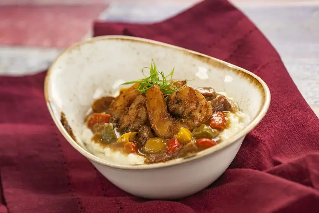 - Shrimp and Grits: Blackened shrimp and cheddar cheese grits with tasso ham gravy, bell peppers, onions, and andouille sausage (New)