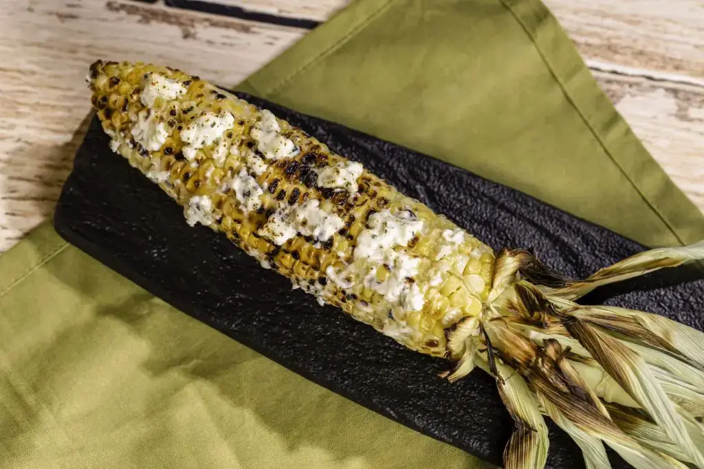 - *Grilled Street Corn on the Cob with savory garlic spread featuring Boursin Dairy-Free Garlic & Fine Herbs Cheese (Plant-based)