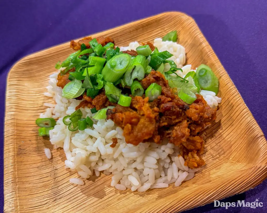 The Spicy Boysenberry Bulgogi over Steamed Rice with Green Onions was a pleasant change. It actually was spicy. The rice was well-cooked. The green onions on top added some freshness and vibrancy. The use of Boysenberry was not overpowering and balanced. This was enjoyable to eat and a nice change from the traditional down at the farm fair. I would easily eat a whole bowl of this, and not just a tasting size!