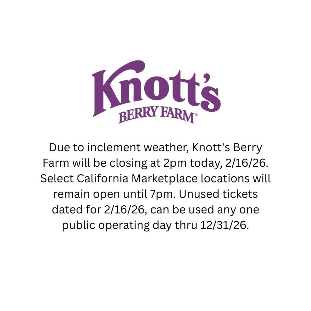 Due to inclement weather, Knott’s Berry Farm will be closing at 2pm today, 2/16/26. Select California Marketplace locations will remain open until 7pm. Unused tickets dated for 2/16/26, can be used any one public operating day thru 12/31/26.