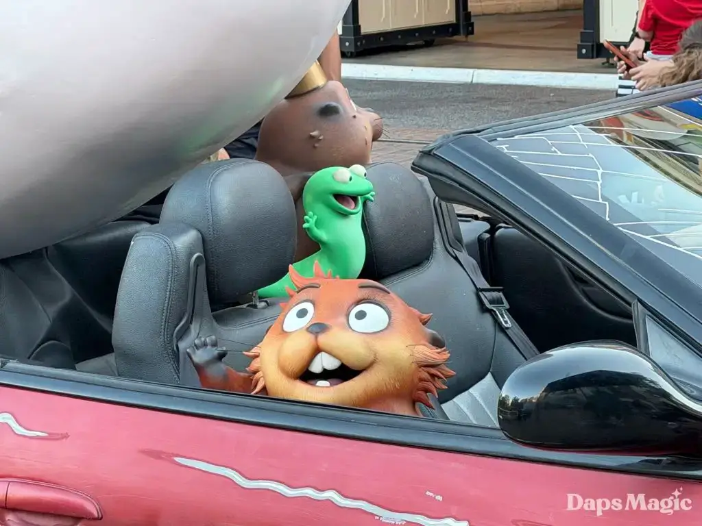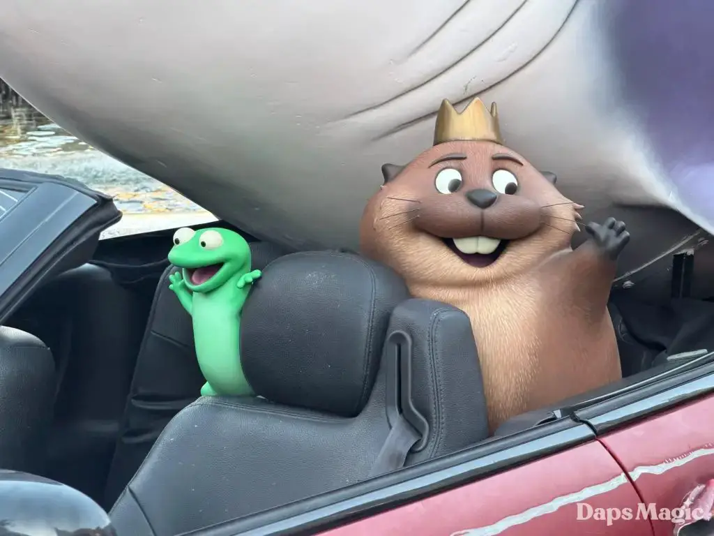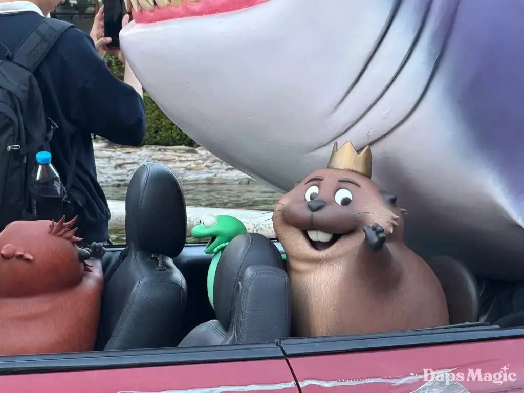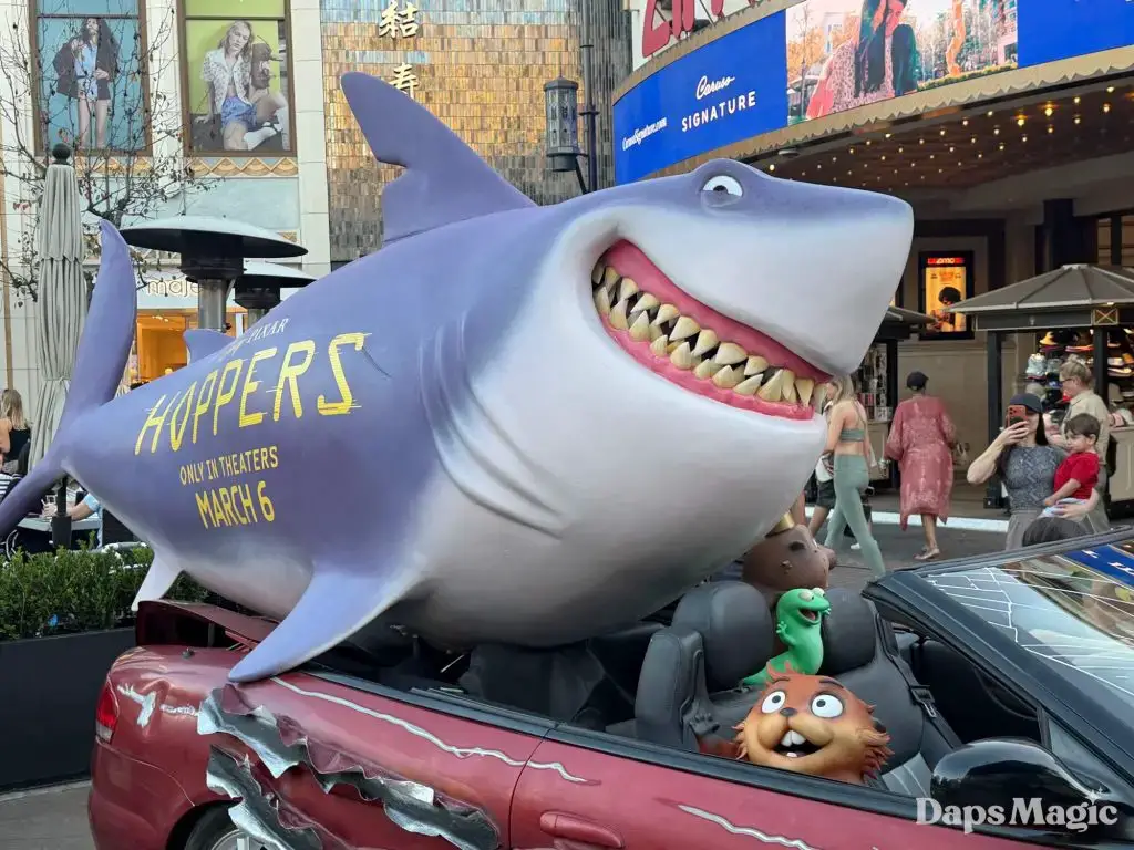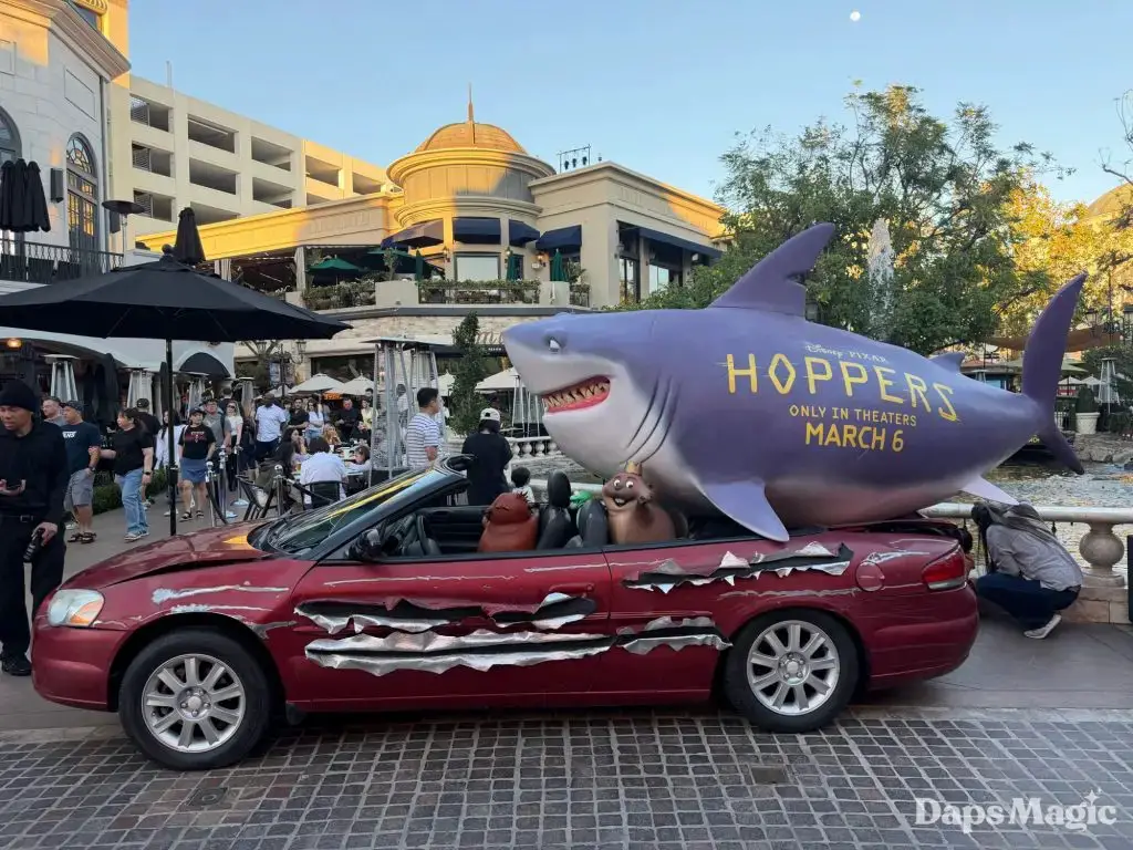 A unique promotional device has arrived at The Grove in Los Angeles for Hoppers. This comes ahead of the release of the new Pixar Animation Studios film on March 6th in theaters. A car with a shark and characters from the film on and in it could be found this weekend at The Grove. The car has clearly had some action that has left it a little worse for wear. The massive shark on top of the car has details about the release of Hoppers printed on its side.