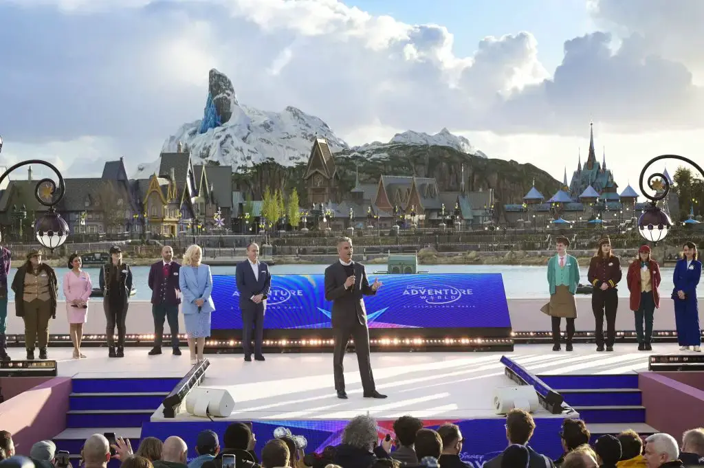 It was a cool evening in Disneyland Paris as dignitaries, celebrities, and other special guests celebrated the opening of World of Frozen and Disney Adventure World at Disneyland Paris. This comes a day after the French President, Emmanuel Macron, stopped by to visit the reimagined second park at Disneyland Paris. On hand for the event were Disney CEO Josh D’Amaro, Disney Experiences Chairman Thomas Mazloum, and other high-profile guests, including Christian Louboutin, Isabelle Huppert, Léna Mahfou, and others. This came ahead of the official opening of this reimagined park on March 29, 2026.
