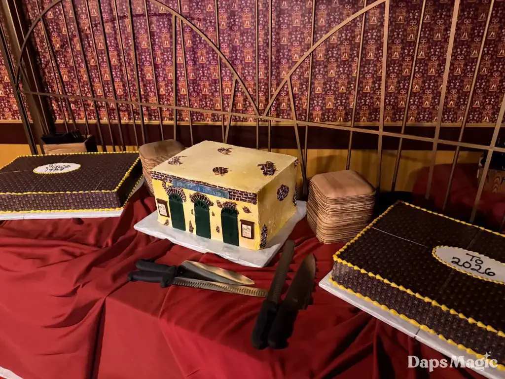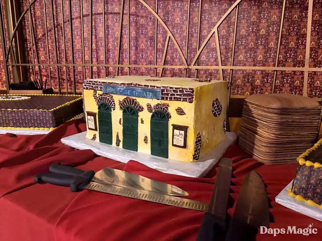 The panel concluded with a toast of Boysenberry Champagne and Boysenberry cake. The top of the two sheet cakes recreated the wallpaper around the renovated theatre. The center cake was a beautiful recreation of the Bird Cage Theatre.