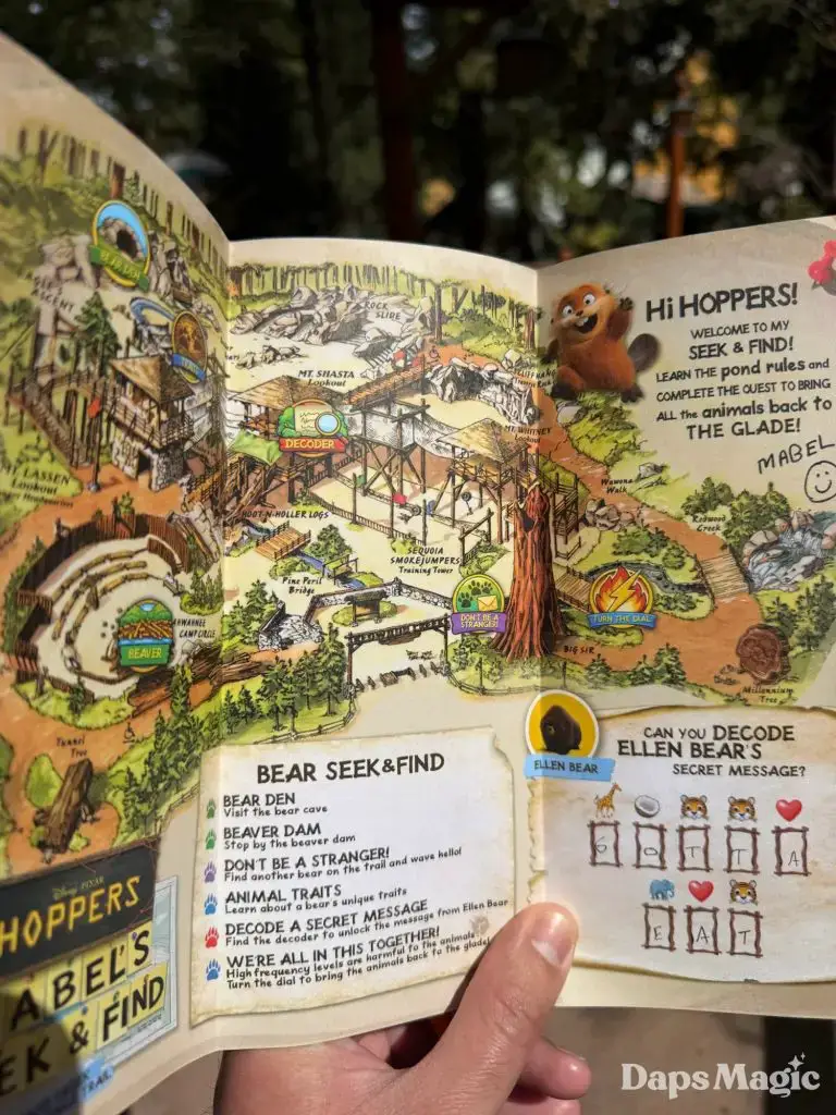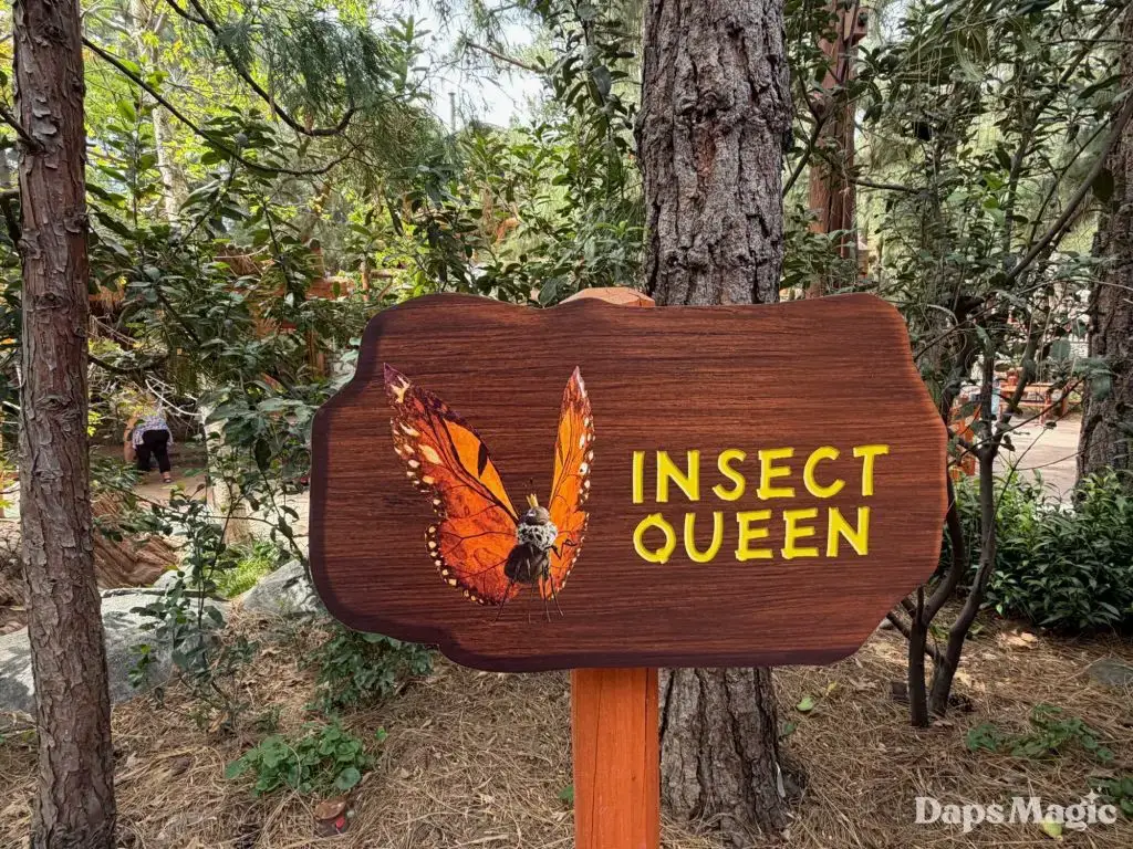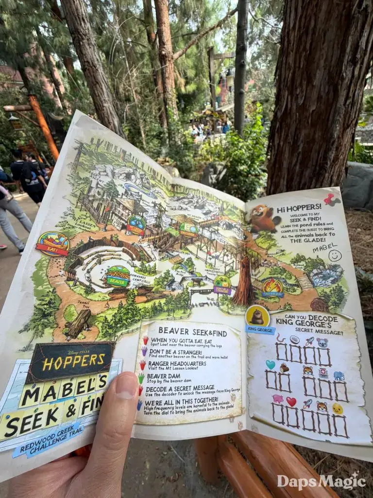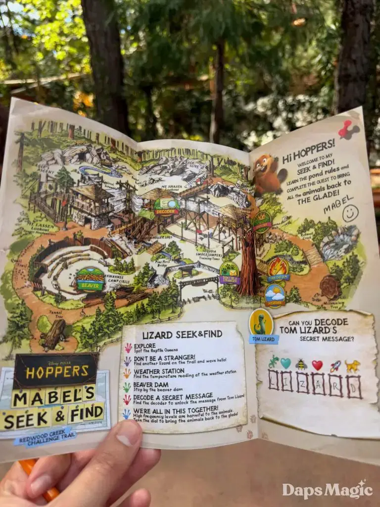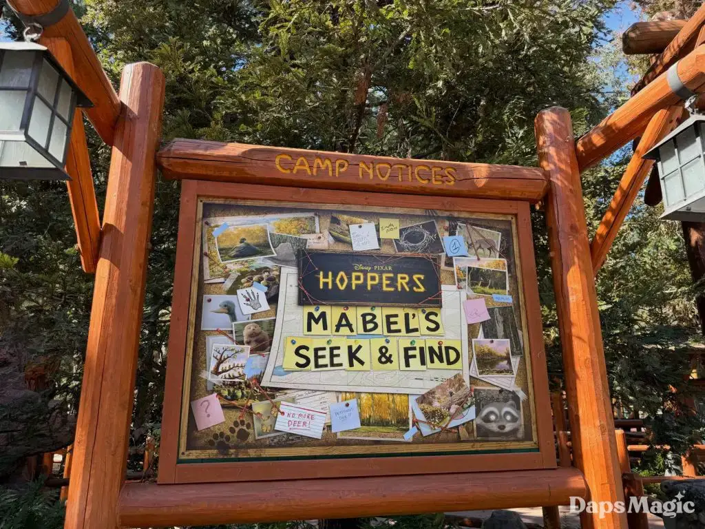 Pixar Animation Studios’ newest film, Hoppers, is now in theaters. With its arrival has come a new adventure at Disney California Adventure. Located on the Redwood Creek Challenge Trail, Mabel’s Seek & Find invites guests to embark on a little adventure, searching for elements from the film in the area with different tasks. Think of it as a Hoppers quest! Upon completion, guests can get a sticker of one of the characters from the film. The stickers feature King George, Ellen Bear, Insect Queen, or Tom Lizzard.