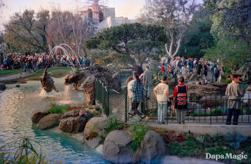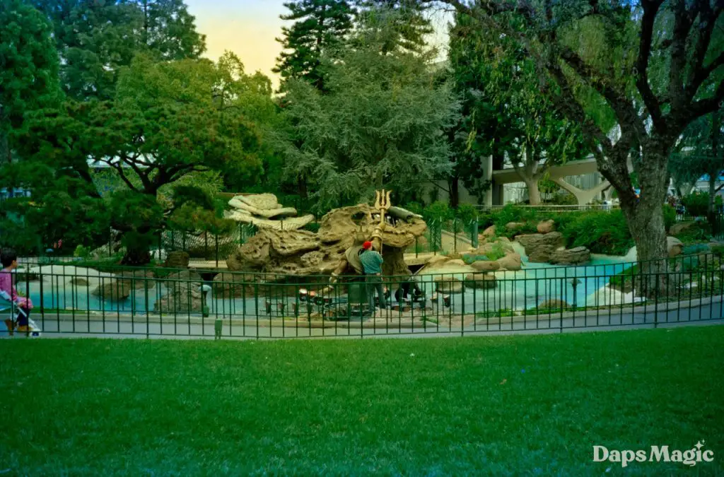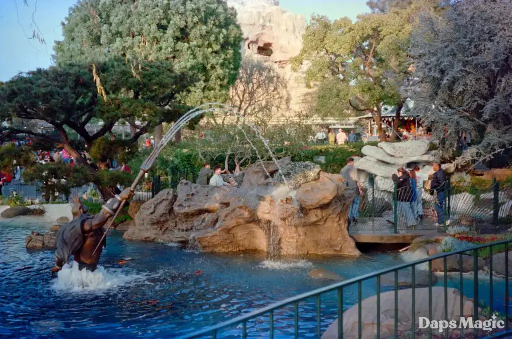 Triton Gardens quietly opened in early 1996. According to the February 9, 1996 issue of the Disneyland Line, it was a “water playground that becomes a romantic, magical corner after dark.” It was located in an area previously referred to as Alpine Gardens, and today it is the home of Pixie Hollow.