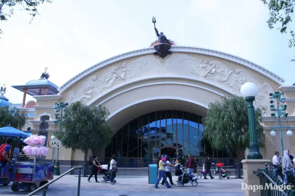 There is also an existing legacy from Triton Gardens in place across the Esplanade at Disney California Adventure. After the garden was closed on August 17, 2008 (to make way for Pixie Hollow), the statue of King Triton was carefully removed and incorporated into the design of the Voyage of the Little Mermaid attraction. His regal presence commands the top of the facade, although his trident no longer spews jets of water over guests. That is something that could be enjoyed only thirty years ago at Disneyland.