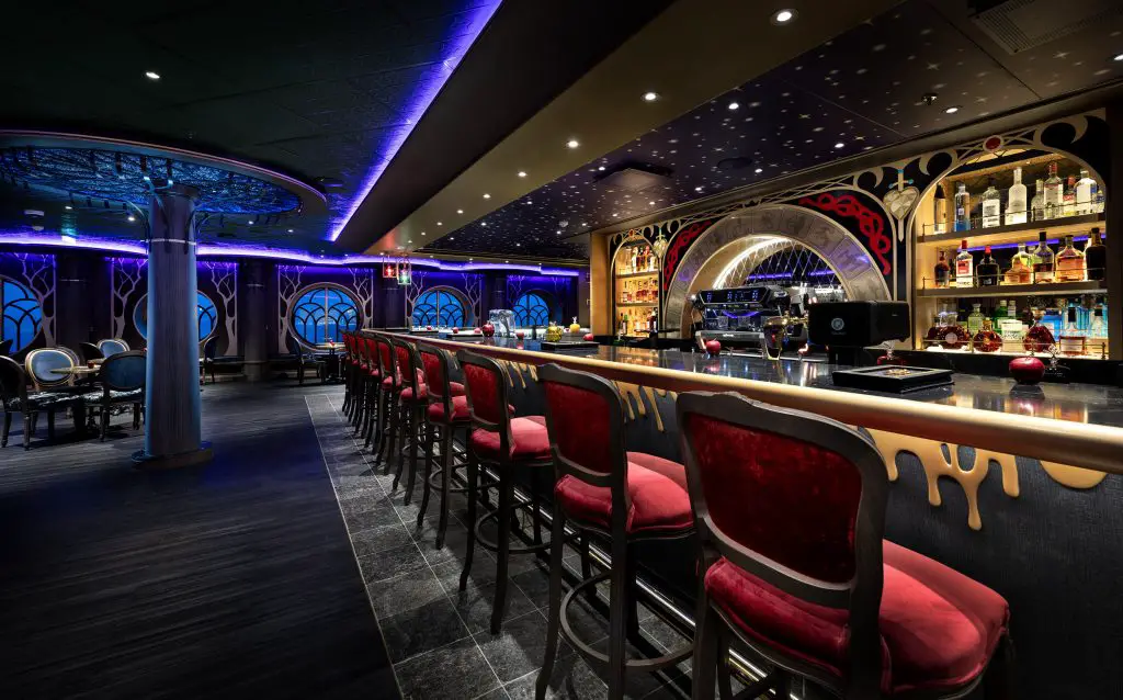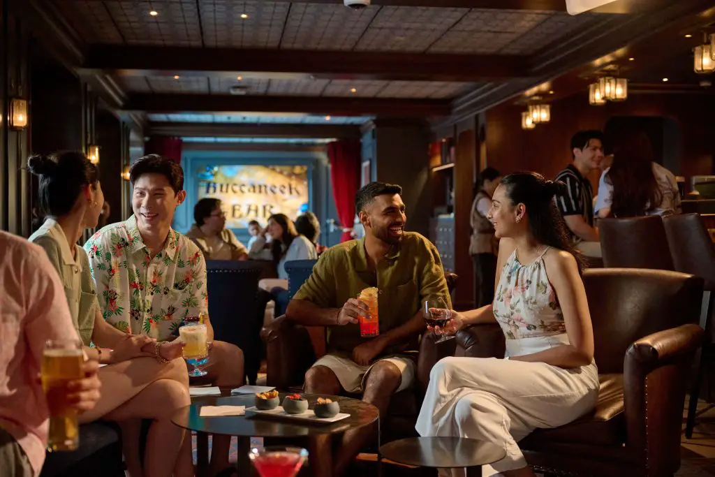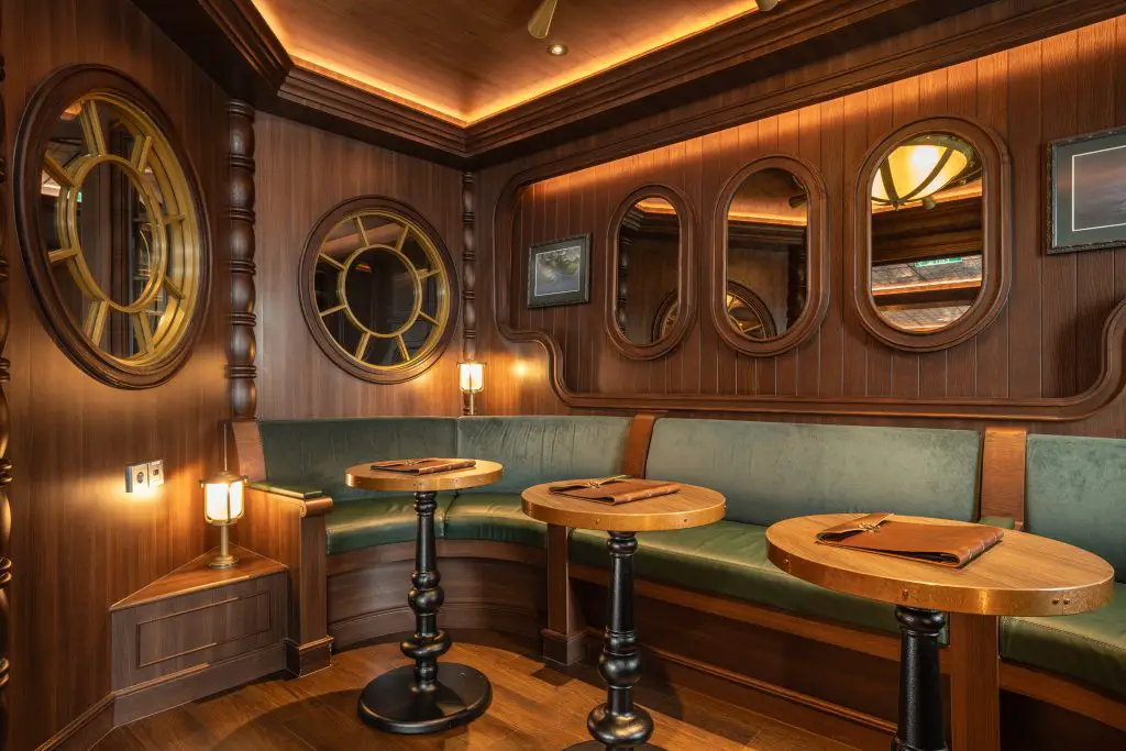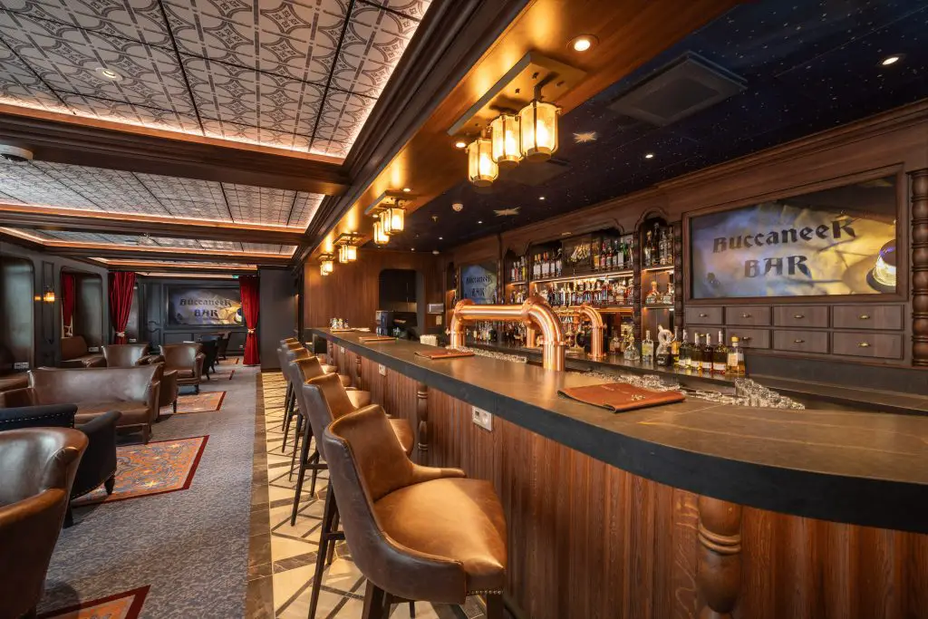 Walk the plank to this swashbuckling pub inspired by the legendary Captain Hook himself. Whether ye be kickin’ yer boots up in the main bar area or lounging in one of 2 private “captain’s quarters” banquettes, ye’ll feel like the captain of yer own high-seas adventure. Savor high-end brews, catch live sporting events and spy breathtaking ocean views through the many oversized porthole windows.Buccaneer Bar is a swashbuckling pub on the Disney Adventure inspired by the devious Captain Hook from Disney’s “Peter Pan.” Guests feel like the captain of their own high seas adventure as they sip high-end brews, watch live sporting events and soak in the ocean views through the venue’s many oversized portholes. (Preston Mack, photographer)Buccaneer Bar is a swashbuckling pub on the Disney Adventure inspired by the devious Captain Hook from Disney’s “Peter Pan.” Guests feel like the captain of their own high seas adventure as they sip high-end brews, watch live sporting events and soak in the ocean views through the venue’s many oversized portholes. (Preston Mack, photographer)Buccaneer Bar is a swashbuckling pub on the Disney Adventure inspired by the devious Captain Hook from Disney’s “Peter Pan.” Guests feel like the captain of their own high seas adventure as they sip high-end brews, watch live sporting events and soak in the ocean views through the venue’s many oversized portholes. (Amy Smith, photographer)Buccaneer Bar is a swashbuckling pub on the Disney Adventure inspired by the devious Captain Hook from Disney’s “Peter Pan.” Guests feel like the captain of their own high seas adventure as they sip high-end brews, watch live sporting events and soak in the ocean views through the venue’s many oversized portholes. (Amy Smith, photographer)