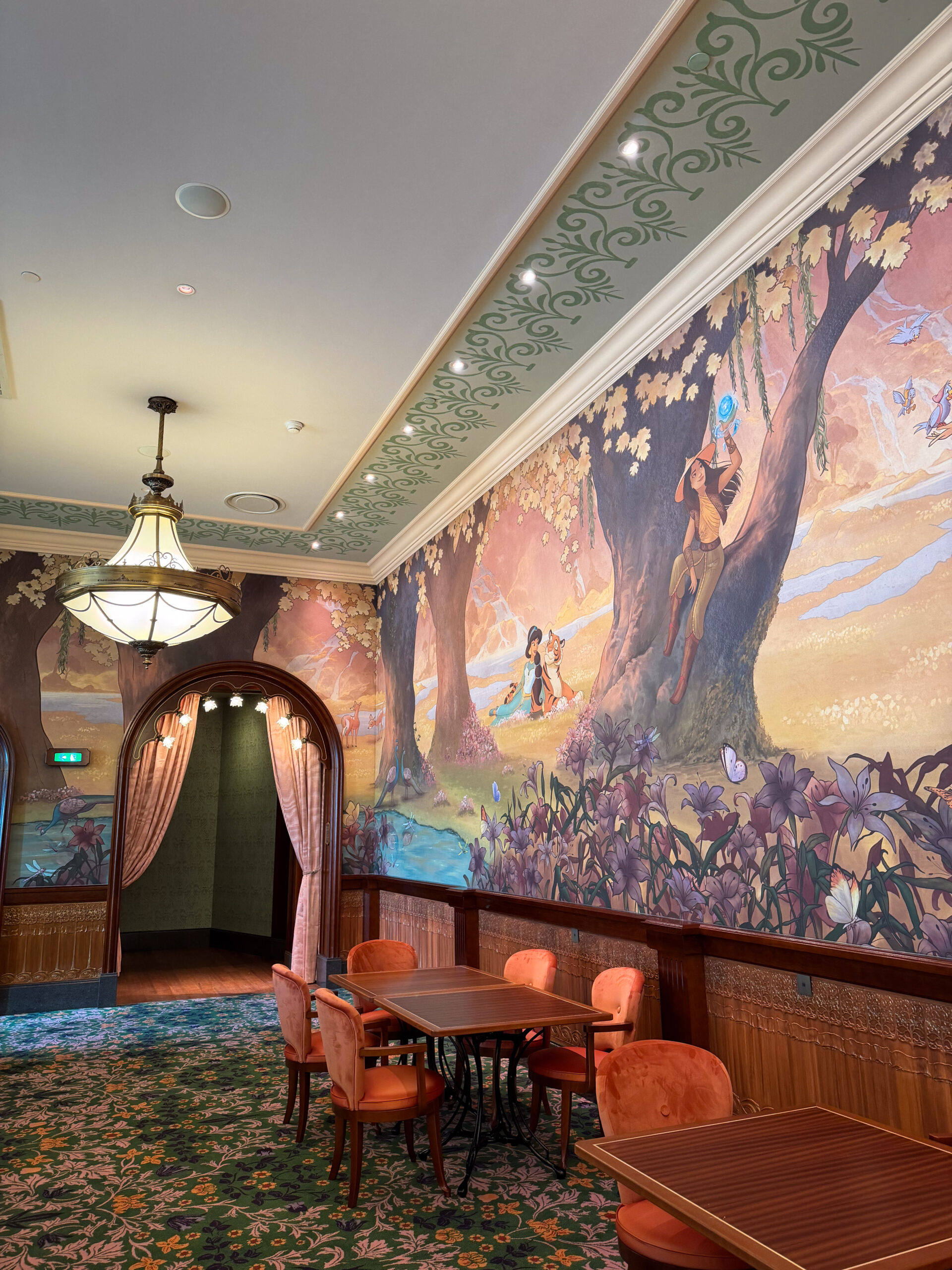 Past the lobby, you walk down a long hallway decorated with portraits of Disney Princess Characters to reach the restaurant’s Reception Room. Among them is Raya, depicted in an Art Nouveau style against a backdrop of ornamentation specific to this style, as explained by Bowie Faas, Principal Creative Producer: