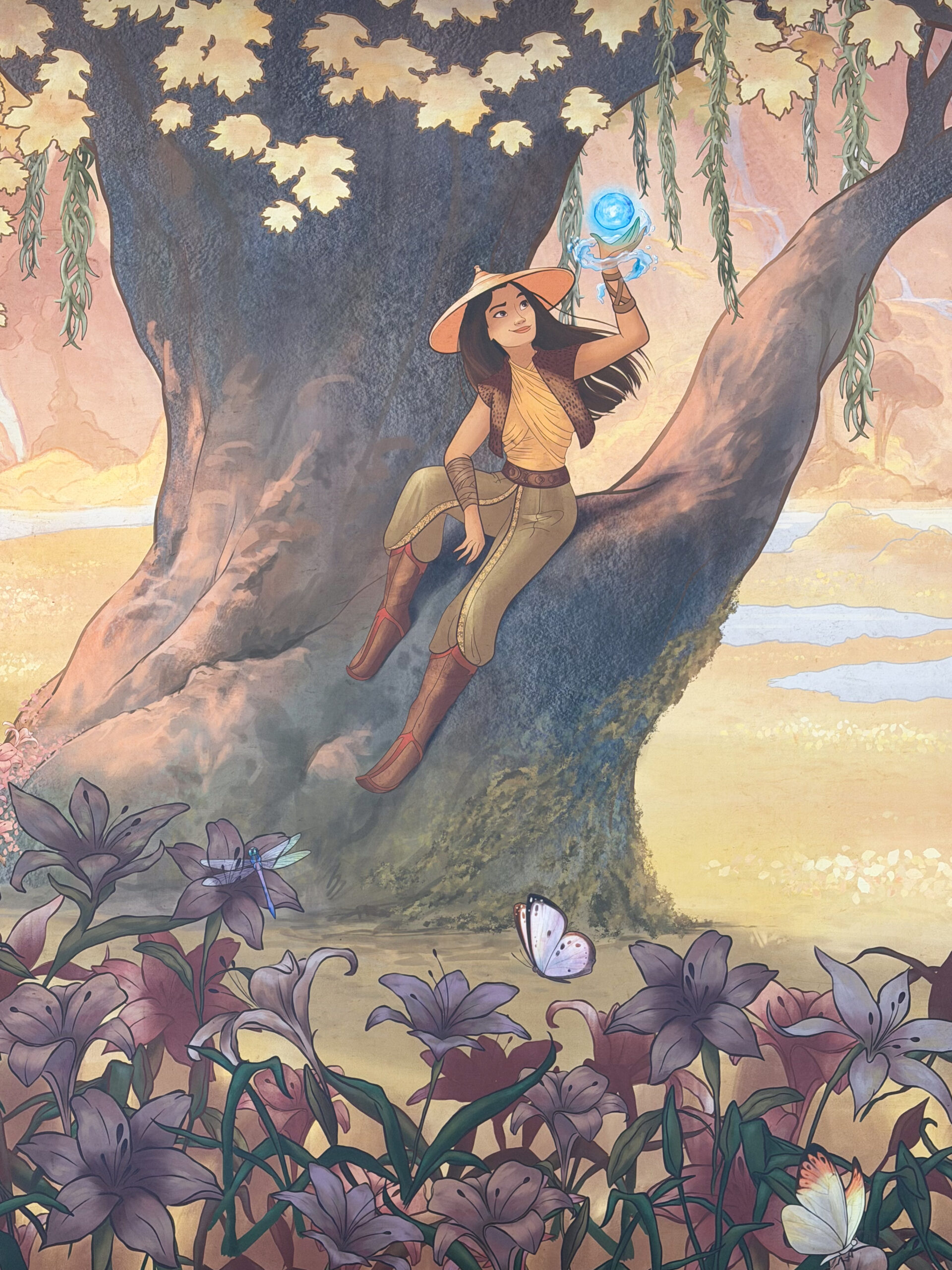 At the end of this hallway, guests can discover the sumptuous Reception Room. A majestic mural stretches the entire length of the restaurant, facing large windows that offer breathtaking views of Adventure Bay. This mural depicts the Disney Princess Characters, as well as Anna and Elsa, in their everyday attire, enjoying a peaceful retreat in the forest, with The Regal View Restaurant and Lounge nestled in its center. Among these emblematic figures, Raya can be found on the left side, sitting on the side of a tree and playing with the Dragon Gem orb. It is a unique work of art, as it is rare to find so many Disney Princess Characters together in one place.