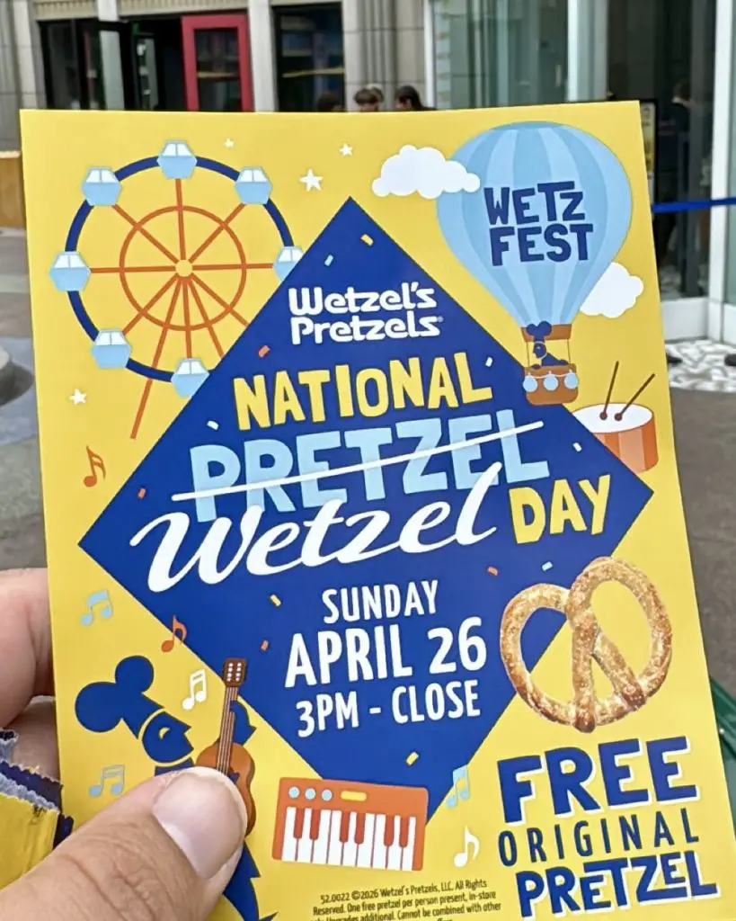 April 26th is National Pretzel Day. If you are Wetzel’s Pretzels, it’s “National Wetzel Day.” The holiday that was undoubtedly a favorite of Stanley from The Office will be celebrated at the Wetzel’s Pretzels location at the Disneyland Resort’s Downtown Disney District. For its celebration, Wetzel’s Pretzels will be offering a free original pretzel per person from 3:00 PM until it closes in the evening. This celebration is also being called “Wetz Fest.”