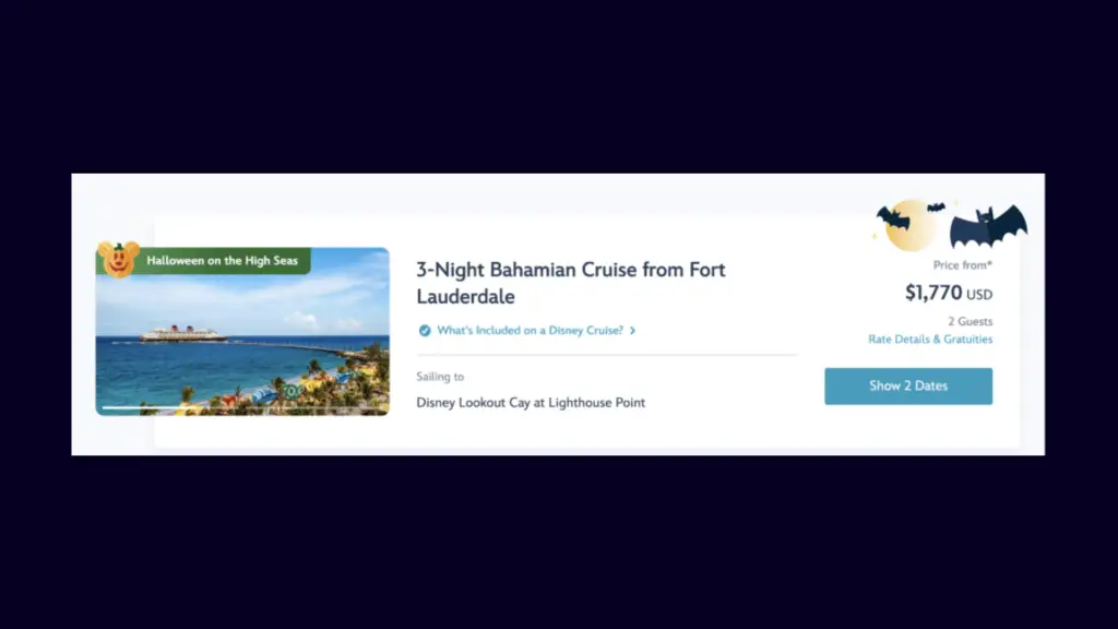 Look for the pumpkins on the graphic for the itinerary to see which cruises offer this experience. Search filters can also be updated to include Halloween on the High Seas as a selected experience; this will show every available sailing that includes this festive event.