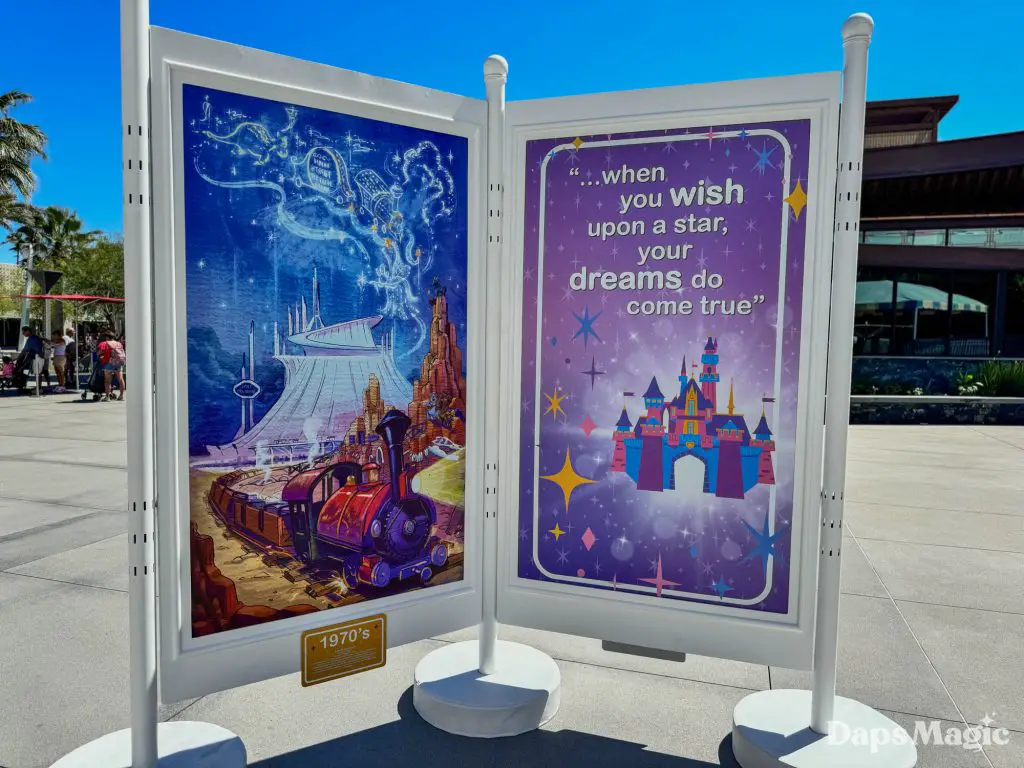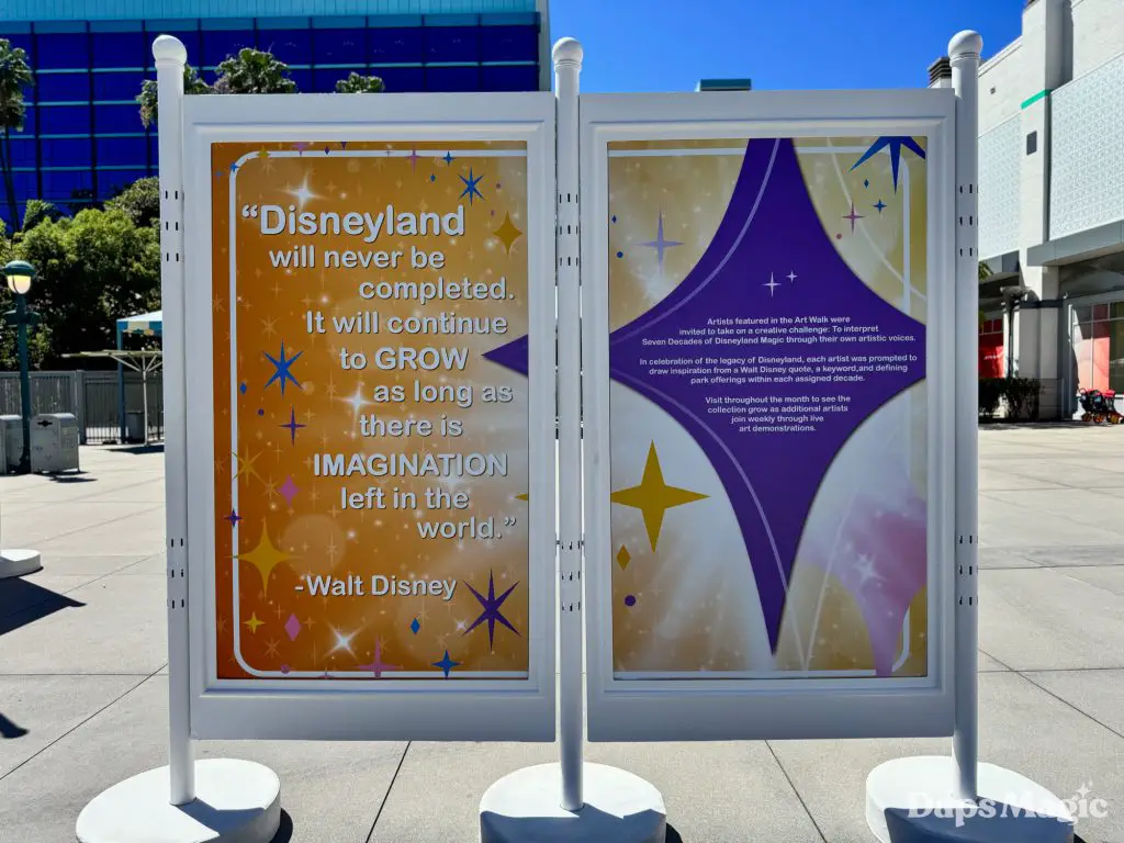 As the Disneyland Resort continues its 70th celebration, more things continue to pop up here and there. Sometimes this is merchandise, sometimes these are special decorations. This time, it is an Art Walk that is on the West end of the Downtown Disney District. This Art Walk appeared earlier this week. It celebrates the legacy of the Disneyland Resort.