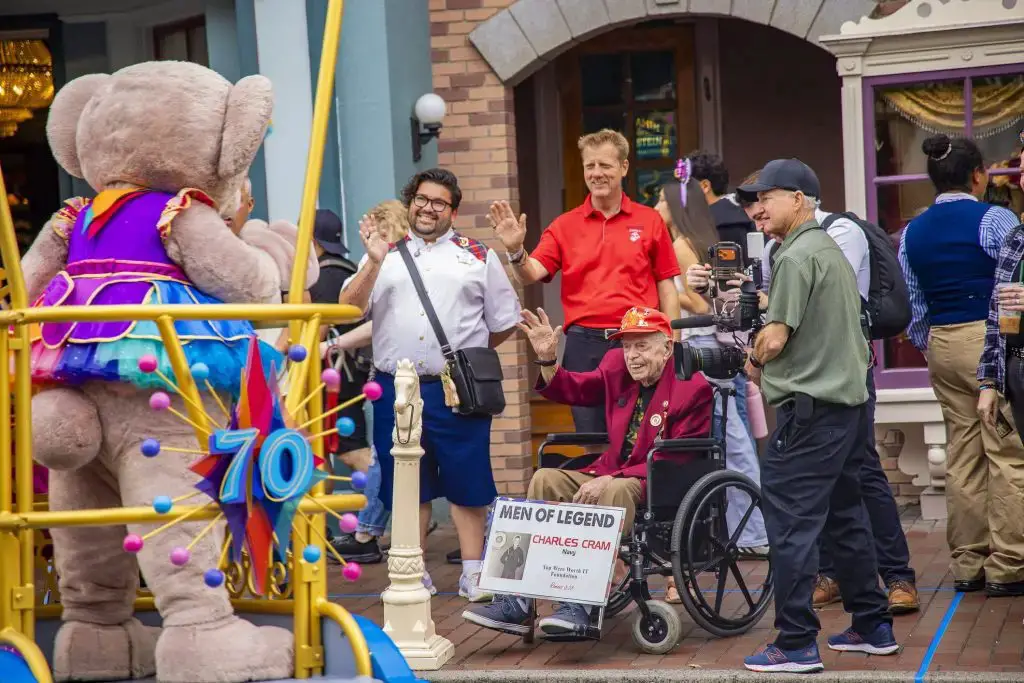 Charles was welcomed to The Happiest Place on Earth with his family by cast members. They were honored with a spot to watch the Celebrate Happy Cavalcade as Disneyland continues to celebrate its 70th anniversary. Charles and his family were also greeted by Donald Duck, who was known for boosting service members’ morale during World War II.
