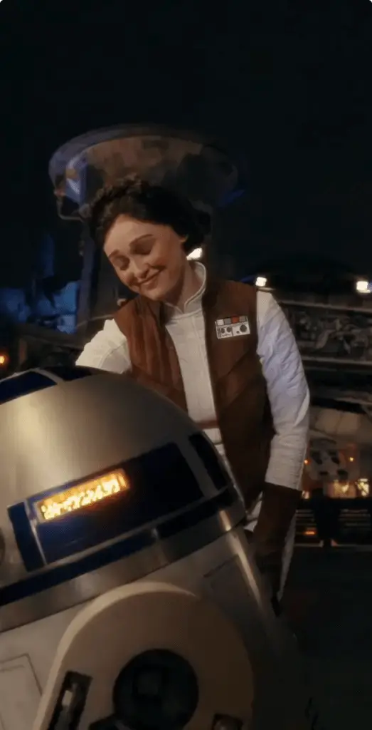 Leia appears in a look that is inspired by her Star Wars Battlefront II “Adventure” appearance. In the video, she appears as she exits the Millennium Falcon. John Williams’ beautiful Princess Leia’s Theme can be heard playing as she appears. She grins as she walks across the concourse. R2-D2 can be heard as she approaches this beloved droid, kneels to him as she does in the original film, and then finally poses in front of the Millennium Falcon. Watch the video here: