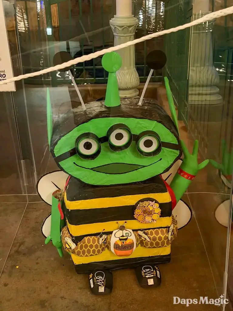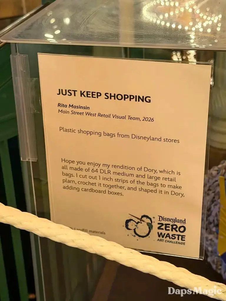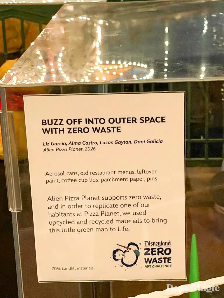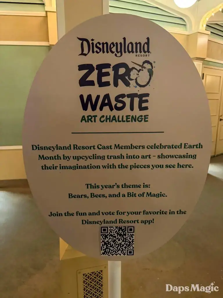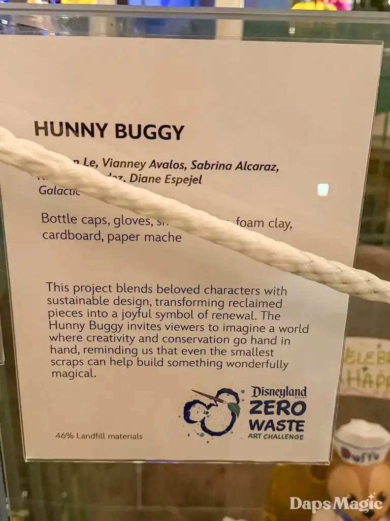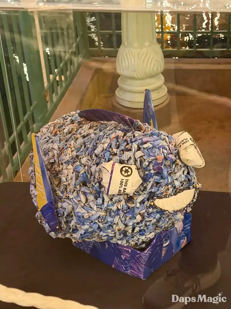 For the Zero Waste Art Challenge, cast members upcycle trash into art. Their imaginative creations can be seen on display under the Silly Symphony Swings in Disney California Adventure. They really are incredible. Daps Magic team member Steven stopped by on Thursday night and took the following photos of this display. Guests who visit and see this display are encouraged to vote for their favorite in the Disneyland app.