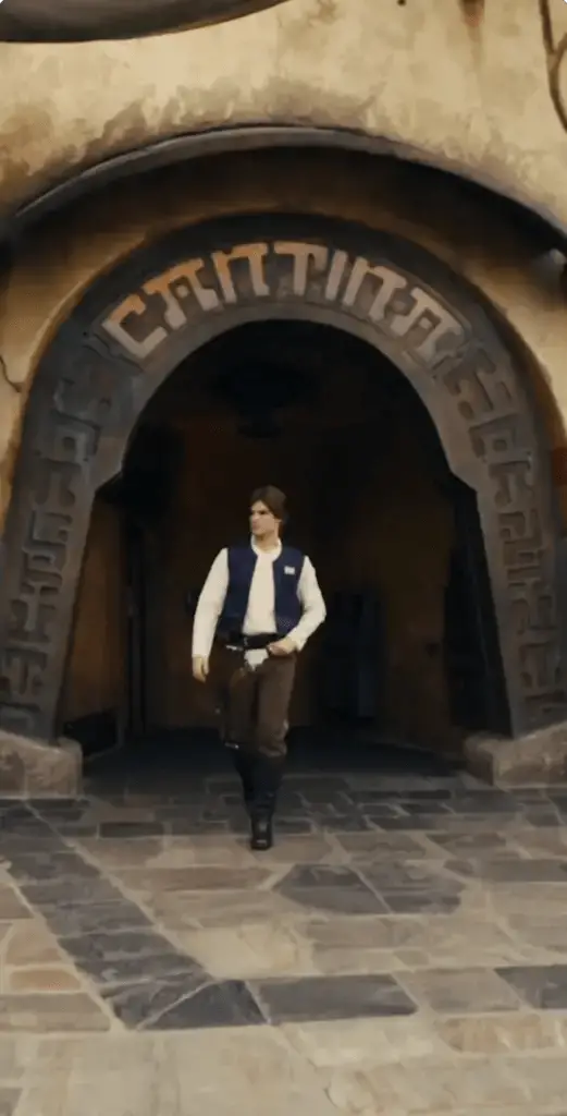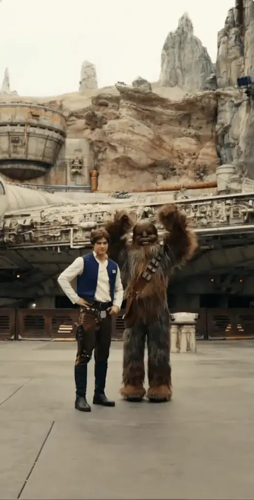 In a little under two weeks, the timeline for Star Wars: Galaxy’s Edge at Disneyland will expand. With this expansion, more characters from more eras of Star Wars will be making appearances at Black Spire Outpost. This includes Luke Skywalker, Princess Leia, and Han Solo. Today, a first look at Han Solo was revealed on social media. The following video was shared ahead of the timeline expansion of Galaxy’s Edge at Disneyland. It shows Han Solo coming out of Oga’s Cantina and then meeting up with Chewbacca in front of his beloved Millennium Falcon. Check out the video here: