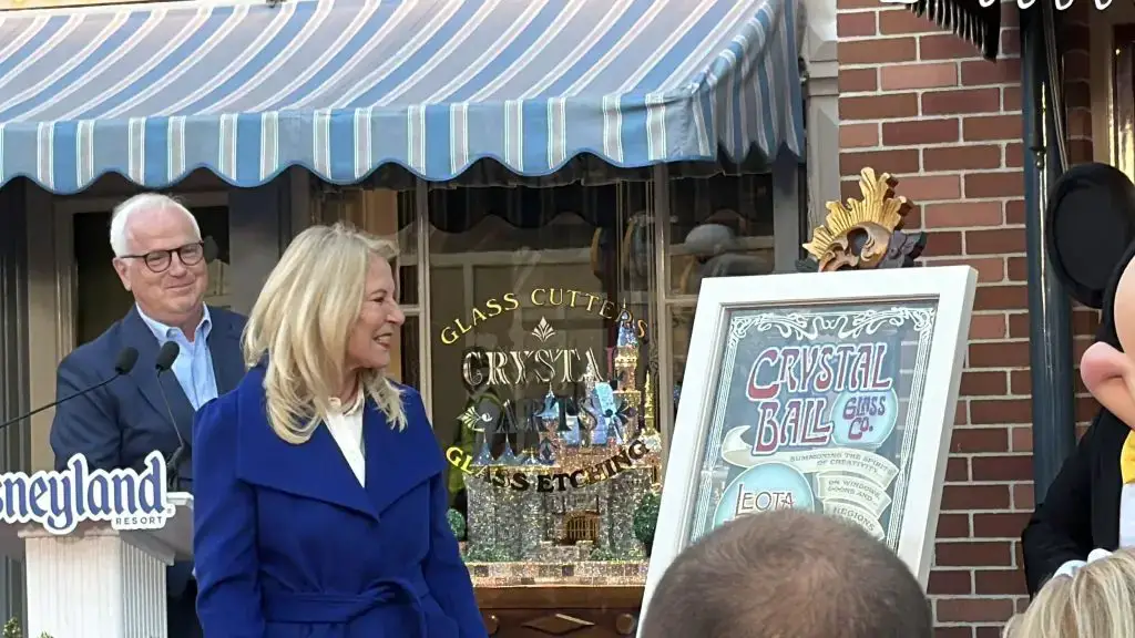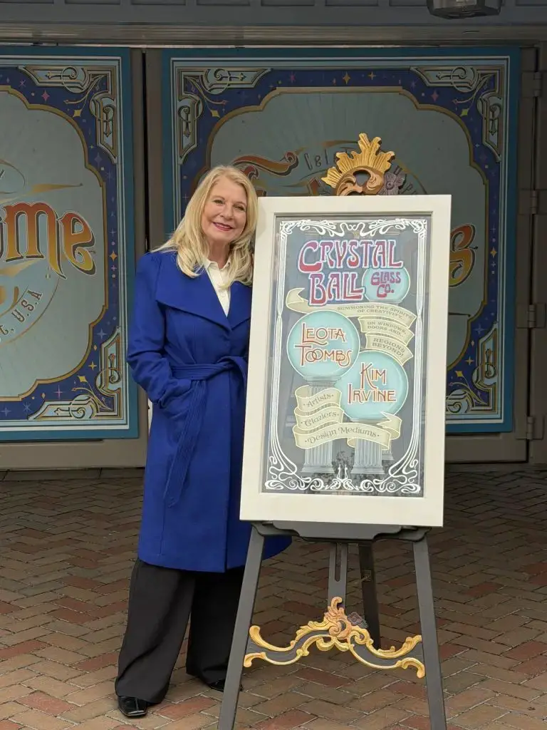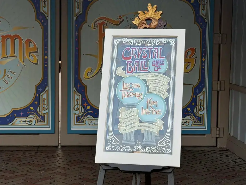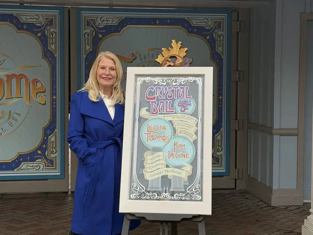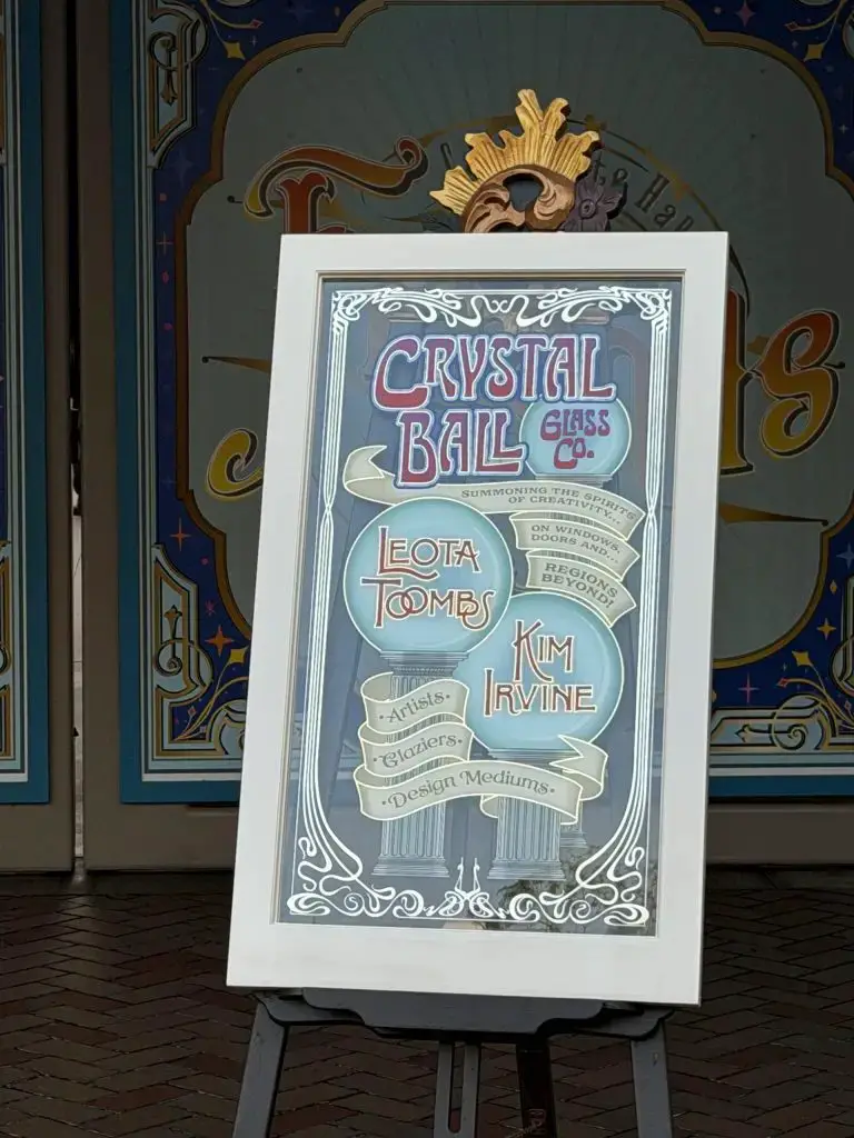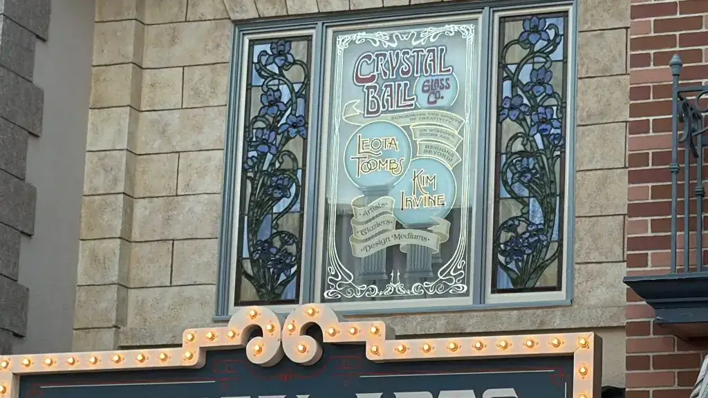 Before Disneyland opened, a special ceremony was held in front of Crystal Arts on Main Street, U.S.A. To honor Kim Irvine and her mother Leota Toombs with a window on Main Street. U.S.A. The shared window says it is for the Crystal Ball Glass Co. This is in reference to the role Toombs has as Madame Leota in the Haunted Mansion, where her head can be seen in the crystal ball in the seance room. During Haunted Mansion Holiday, Irvine replaces her mother in the role.