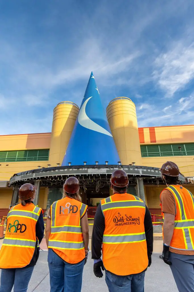 Disney has shared that Mickey Mouse’s sorcerer hat has been installed on the front of this new experience. In a photo that was released, Imagineers can be seen looking at their work after the hat was installed. Previous concept art was shared that shows how this sorcerer’s hat fits into the larger area. The arrival of the hat is a major step in making the area look and feel like the Walt Disney Animation Studios building.